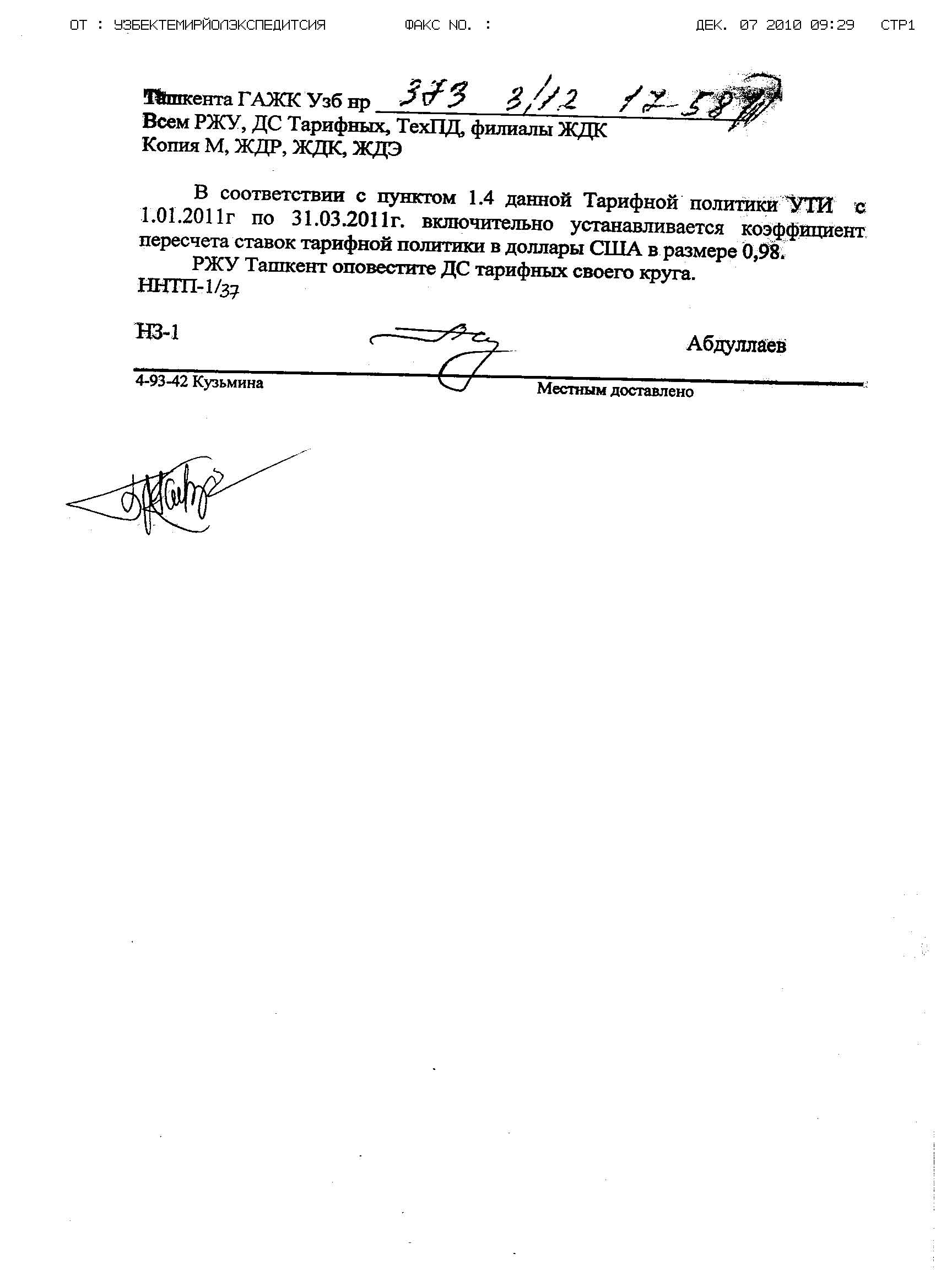 ОТ: УЗБЕКТЕМИРЙОЛЭКСПЕДИТСИЯ ФАКС NO. : ДЕК. 07 2010 09:29 СТР1 Ташкента ГАЖК Узб нр 373 3/12 17:58 Всем РЖУ, ДС Тарифных, ТехПД, филиалы ЖДК Копия М, ЖДР, ЖДК, ЖДЭ В соответствии с пунктом 1.4 данной Тарифной политики УТИ с 1.01.2011г по 31.03.2011г. включительно устанавливается коэффициент пересчета ставок тарифной политики в доллары США в размере 0,98. РЖУ Ташкент оповестите ДС тарифных своего круга. ННТП-1/37