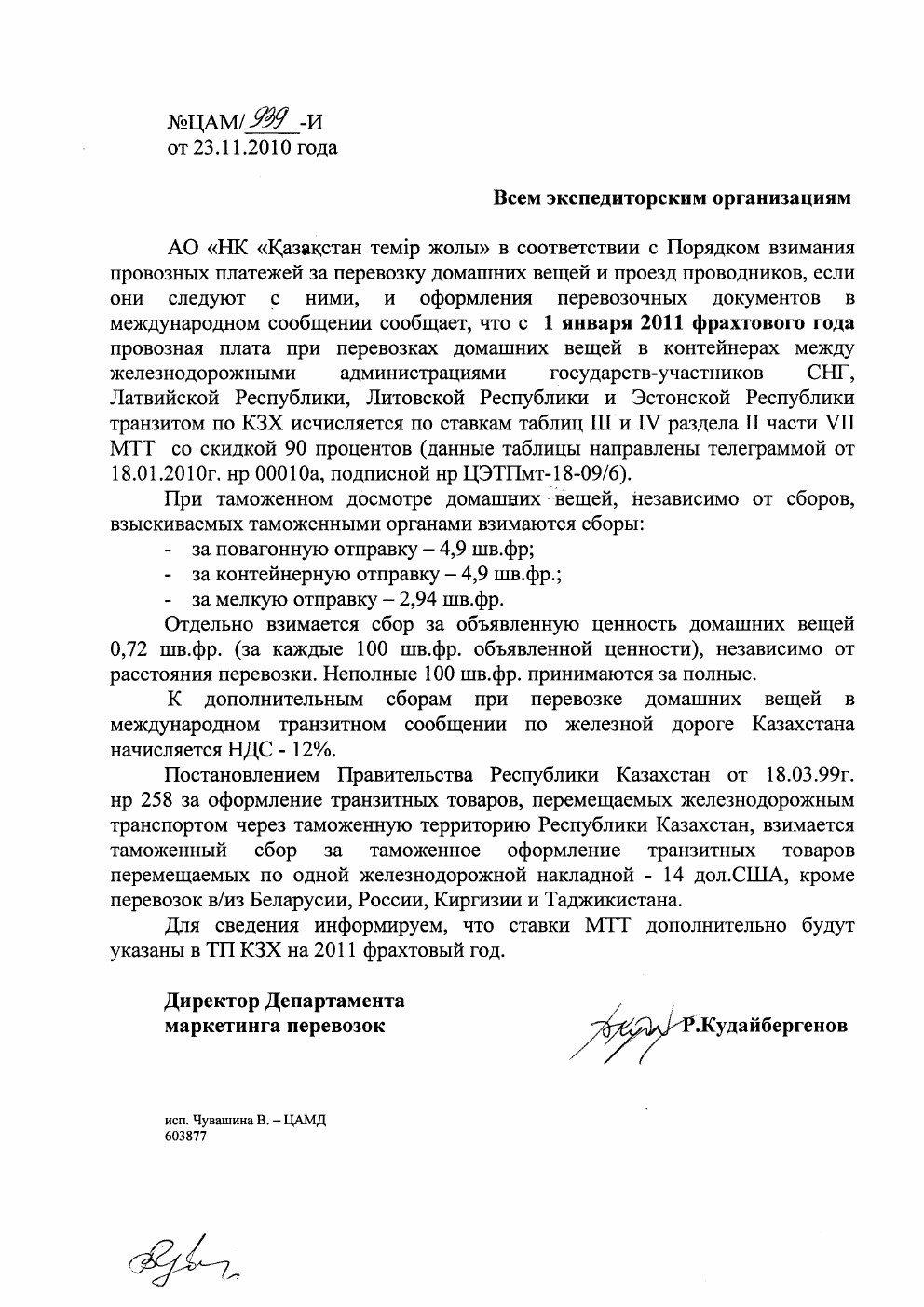 | № ЦАМ/939-И от 23.11.2010 года Всем экспедиторским организациям
