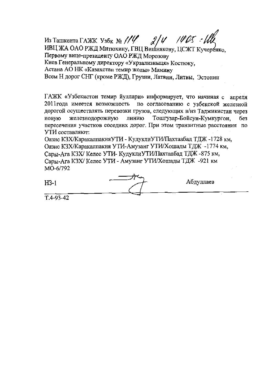 Всем Н дорог СНГ (кроме РЖД), Грузии, Латвии, Литвы, Эстонии ГАЖК «Узбекистон темир йуллари» информирует, что начиная с апреля 2011года имеется возможность по согласованию с узбекской железной дорогой осуществлять перевозки грузов, следующих в/из Таджикистан через новую железнодорожную линию Тошгузар-Бойсун-Кумкургон, без пересечения участков соседних дорог. При этом транзитные расстояния по УТИ составляют: Оазис КЗХ/КаракалпакияУТИ - КудуклиУТИ/Пахтаабад ТДЖ -1728 км, Оазис КЗХ/Каракалпакия УТИ-Амузанг УТИ/Хошады ТДЖ -1774 км, Сары-Ага КЗХ/ Келес УТИ- КудуклиУТИ/Пахтаабад ТДЖ -875 км, Сары-Ага КЗХ/ Келес УТИ - Амузанг УТИ/Хошады ТДЖ -921 км МО-6/792 НЗ-1 Абдуллаев Т.4-93-42 |
