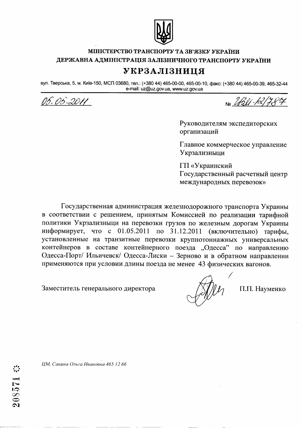 Государственная администрация железнодорожного транспорта Украины в соответствии с решением, принятым Комиссией по реализации тарифной политики Укрзализныци на перевозки грузов по железным дорогам Украины информирует, что с 01.05.2011 по 31.12.2011 (включительно) тарифы, установленные на транзитные перевозки крупнотоннажных универсальных контейнеров в составе контейнерного поезда „Одесса" по направлению Одесса-Порт/ Ильичевск/ Одесса-Лиски - Зерново и в обратном направлении применяются при условии длины поезда не менее 43 физических вагонов.