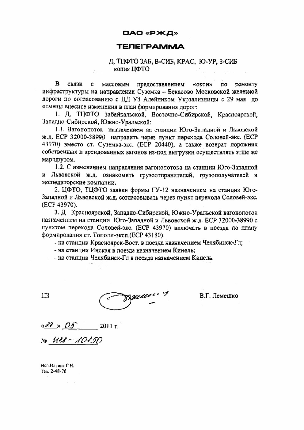 Д, ТЦФТО ЗАБ, В-СИБ, КРАС, Ю-УР, З-СИБ копия ЦФТО В связи с массовым предоставлением «окон» по ремонту инфраструктуры на направлении Суземка – Бекасово Московской железной дороги по согласованию с ЦД УЗ Алейником Укрзализницы с 29 мая до отмены внести изменения в план формирования дорог: 1. Д, ТЦФТ Забайкальской, Восточно-Сибирской, Красноярской, Западно-Сибирской, Южно-Уральской: 1. 1.1. Вагонопоток назначением на станции Юго-Западной и Львовской ж.д. ЕСР 32000-38990 направить через пункт перехода Соловей-экс. (ЕСР 43970) вместо ст. Суземка-экс. (ЕСР 20440), а также возврат порожних собственных и арендованных вагонов из-под выгрузки осуществлять этим же маршрутом. 2. 1.2. С изменением направления вагонопотока на станции Юго-Западной и Львовской ж.д. ознакомить грузоотправителей, грузополучателей и экспедиторские компании. 3. 2. ЦФТО, ТЦФТО заявки формы ГУ-12 назначением на станции Юго-Западной и Львовской ж.д. согласовывать через пункт перехода Соловей-экс. (ЕСР 43970). 4. 3. Д Красноярской, Западно-Сибирской, Южно-Уральской вагонопоток назначением на станции Юго-Западной и Львовской ж.д. ЕСР 32000-38990 с пунктом перехода Соловей-экс. (ЕСР 43970) включать в поезда по плану формирования ст. Тополи-эксп. (ЕСР 43180): 5. – на станции Красноярск-Вост. в поезда назначением Челябинск-Гл; 6. – на станции Инская в поезда назнаением Кинель; 7. – на станции Челябинск-Гл в поезда назначением Кинель. ЦЗ В.Г. Лемешко «27» 05 2011г. № ИСК – 10150 Исп. Ильина Г.Н. Тел. 2-48-76 |