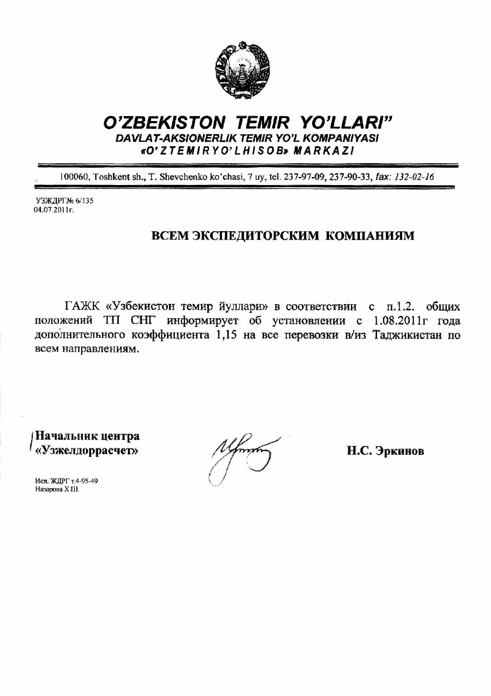 Начальник центра «Узжелдоррасчет» Эркинов Н.С.