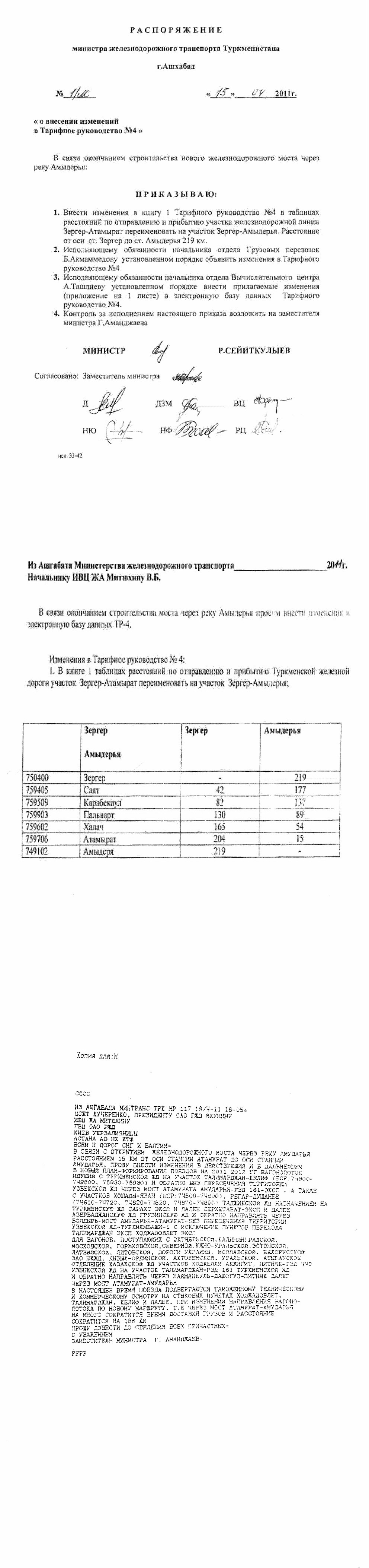 г.Ашхабад № 1/М « 15 » 04 2011г. «о внесении изменений В Тарифное руководство №4» В связи с окончанием строительства нового железнодорожного моста через реку Амыдерья: П Р И К А З Ы В А Ю 1. Внести изменения в книгу 1 Тарифного руководства №4 в таблицах расстояний по отправлению и прибытию участка железнодорожной линии Зергер-Атамырат переименовать на участок Зергер-Амыдерья 219 км. 2. Исполняющему обязанности начальника отдела Грузовых перевозок Б.Акмаммедову установленным порядке объявить изменения в Тарифного руководства №4. 3. Исполняющему обязанности начальника отдела Вычислительного центра А.Ташлиеву установленном порядке внести прилагаемые изменения (приложение на 1 листе) в электронную базу данных Тарифного руководство №4. 4. Контроль за исполнением настоящего приказа возложить на заместителя министра Г.Аманджаева. МИНИСТР Р.СЕЙИТКУЛЫЕВ