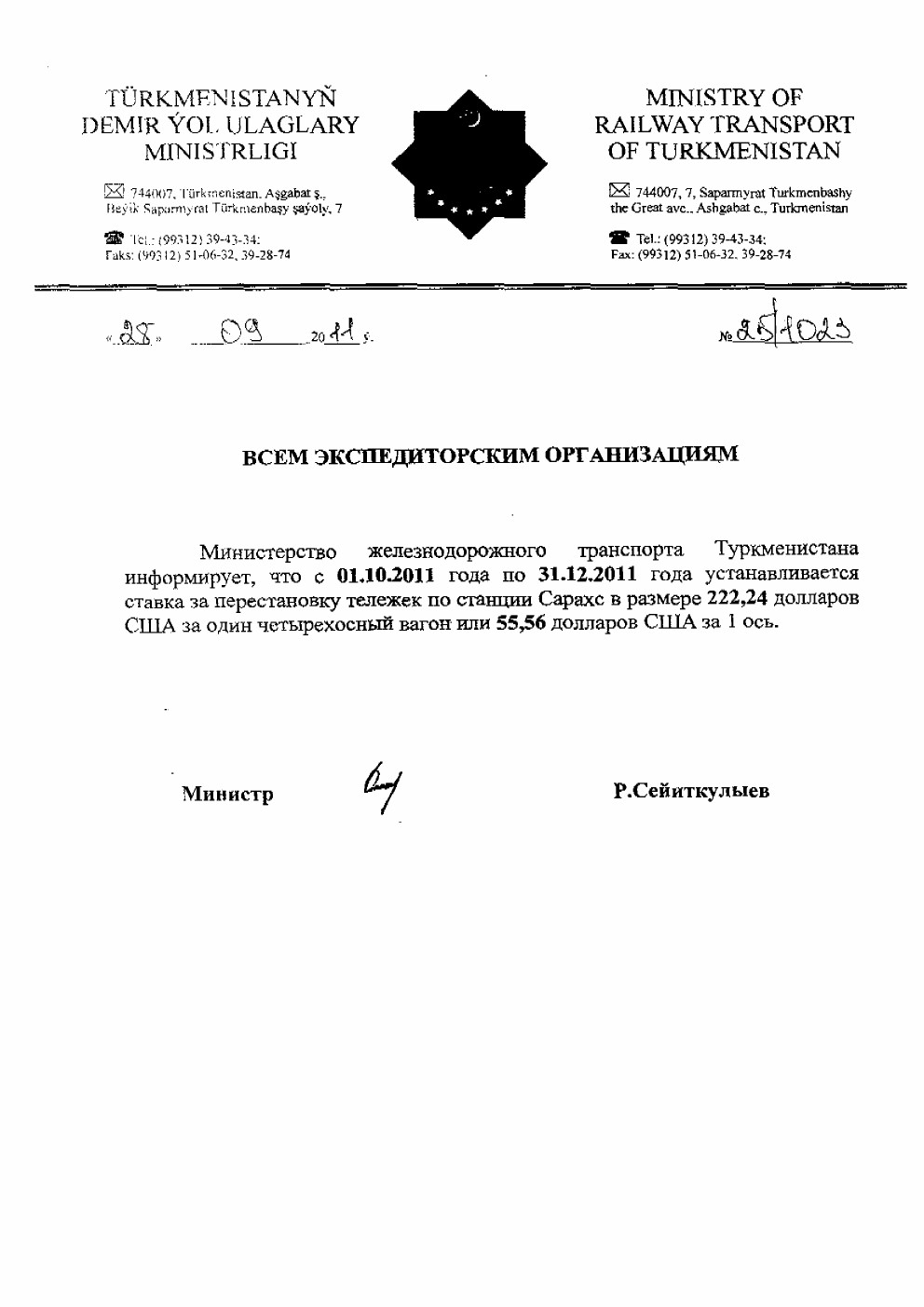 Министерство железнодорожного транспорта Туркменистана информирует, что с 01.10.2011 года по 31.12.2011 года устанавливается ставка за перестановку тележек по станции Сарахс в размере 222,24 долларов США за один четырехосный вагон или 55,56 долларов США за 1 ось. Министр Р. Сейиткулыев |