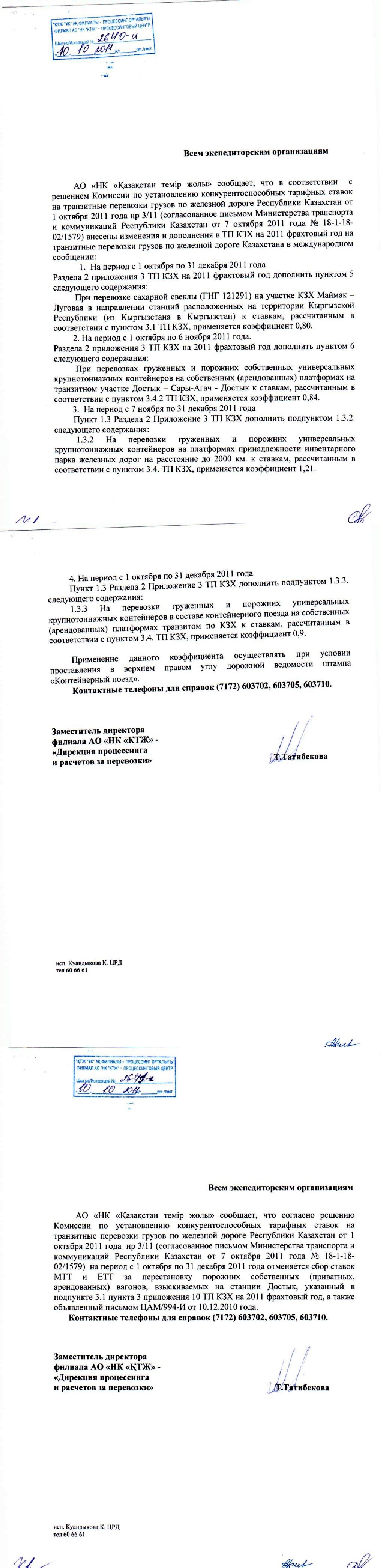 АО «НК «Казакстан темір жолы» сообщает, что в соответствии с решением Комиссии по установлению конкурентоспособных тарифных ставок на транзитные перевозки грузов по железной дороге Республики Казахстан от 1 октября 2011 года нр 3/11 (согласованное письмом Министерства транспорта и коммуникаций Республики Казахстан от 7 октября 2011 года № 18-1-18- 02/1579) внесены изменения и дополнения в ТП КЗХ на 2011 фрахтовый год на транзитные перевозки грузов по железной дороге Казахстана в международном сообщении: 1. На период с 1 октября по 31 декабря 2011 года Раздела 2 приложения З ТП КЗХ на 2011 фрахтовый год дополнить пунктом 5 следующего содержания: При перевозке сахарной свеклы (ГНГ 121291) на участке КЗХ Маймак - Луговая в направлении станций расположенных на территории Кыргызской Республики (из Кыргызстана в Кыргызстан) к ставкам, рассчитанным в соответствии с пунктом 3.1 ТП КЗХ, применяется коэффициент 0.80. 2. На период с 1 октября по 6 ноября 2011 года. Раздела 2 приложения 3 ТП КЗХ на 2011 фрахтовый год дополнить пунктом 6 следующего содержания: При перевозках груженных и порожних собственных универсальных крупнотоннажных контейнеров на собственных (арендованных) платформах на транзитном участке Достык - Сары-Агач - Достык к ставкам, рассчитанным в соответствии с пунктом 3.4.2 ТП КЗХ, применяется коэффициент 0,84. 3. На период с 7 ноября по 31 декабря 2011 года Пункт 1.3 Раздела 2 Приложение 3 ТП КЗХ дополнить подпунктом 1.3.2. следующего содержания: 1.3.2 На перевозки груженных и порожних универсальных крупнотоннажных контейнеров на платформах принадлежности инвентарного парка железных дорог на расстояние до 2000 км. к ставкам, рассчитанным в соответствии с пунктом 3.4. ТП КЗХ, применяется коэффициент 1,21. 4. На период с 1 октября по 31 декабря 2011 года Пункт 1.3 Раздела 2 Приложение З ТП КЗХ дополнить подпунктом 1.3.3. следующего содержания: 1.3.3 На перевозки груженных и порожних универсальных крупнотоннажных контейнеров в составе контейнерного поезда на собственных (арендованных) платформах транзитом по КЗХ к ставкам, рассчитанным в соответствии с пунктом 3.4. ТП КЗХ, применяется коэффициент 0,9. Применение данного коэффициента осуществлять при условии проставления в верхнем правом углу дорожной ведомости штампа «Контейнерный поезд».
