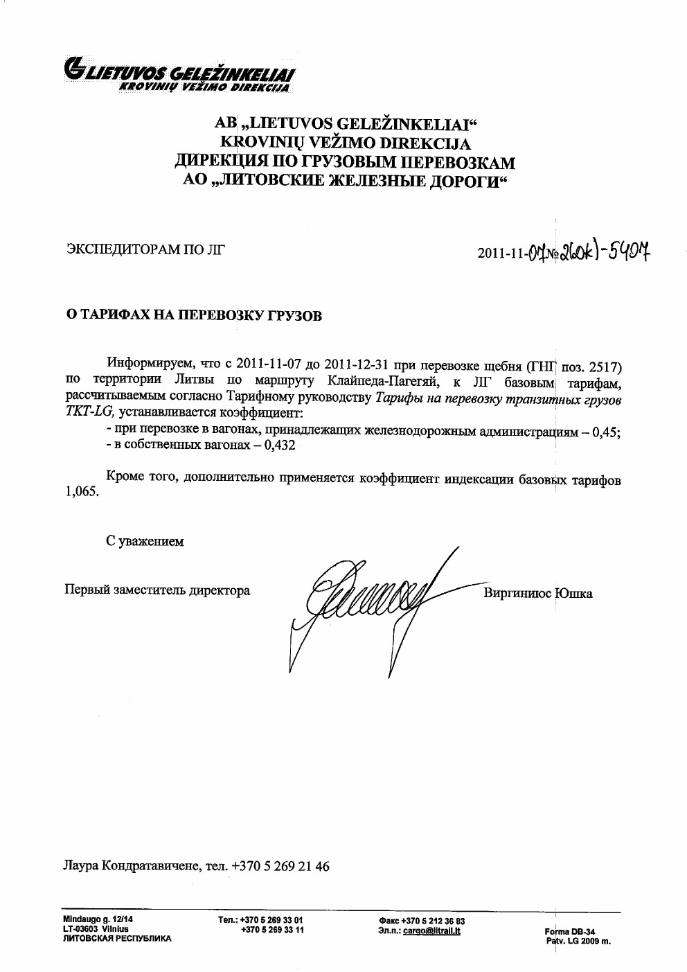 О тарифах на перевозку грузов Информируем, что с 2011-11-07 до 2011-12-31 при перевозке щебня (ГНГ поз. 2517) по территории Литвы по маршруту Клайпеда-Пагегяй, к ЛГ базовым тарифам, рассчитываемым согласно Тарифному руководству Тарифы на перевозку транзитных грузов TKT-LG, устанавливается коэффициент: - при перевозке в вагонах, принадлежащих железнодорожным администрациям – 0,45; - в собственных вагонах – 0,432. Кроме того, дополнительно применяется коэффициент индексации базовых тарифов 1,065. С уважением Первый заместитель директора Виргиниюс Юшка Лаура Кондратавичене, тел. +370 5 269 21 46
