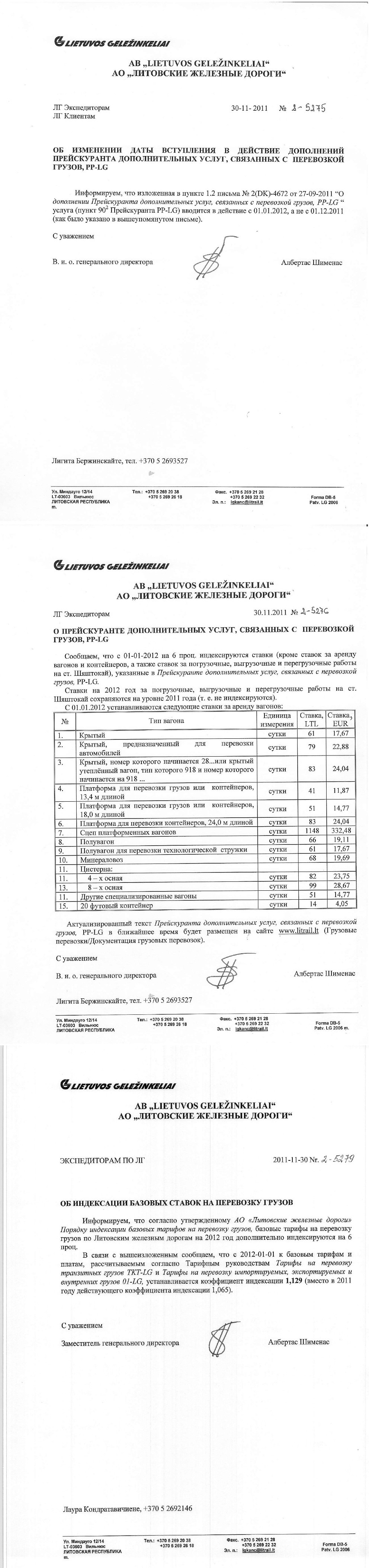 О ПРЕЙСКУРАНТЕ ДОПОЛНИТЕЛЬНЫХ УСЛУГ, СВЯЗАННЫХ С ПЕРЕВОЗКОЙ ГРУЗОВ, PP-LG Сообщаем, что с 01-01-2012 на 6 проц. индексируются ставки (кроме ставок за аренду вагонов и контейнеров, а также ставок за погрузочные, выгрузочные и перегрузочные работы на ст. Шяштокай),указанные в Прейскуранте дополнительных услуг, связанных с перевозкой грузов, PP-LG. Ставки на 2012 год за погрузочные, выгрузочные и перегрузочные работы на ст. Шяштокай охраняются на уровне 2011 года (т. е. не индексируются). С 01.01.2012 устанавливаются следующие ставки за аренду вагонов: