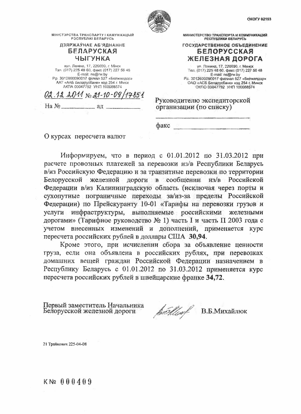 Информируем, что в период с 01.01.20 І 2 по 31,03.2012 при расчете провозных платежей за перевозки из/в Республики Беларусь в/из Российскую Федерацию и за транзитные перевозки по территории Белорусской железной дороги в сообщении из/в Российской Федерации в/из Калининградскую область (исключая через порты и сухопутные пограничные переходы за/из-за пределы Российской Федерации) по Прейскуранту 10-01 «Тарифы на перевозки грузов и услуги инфраструктуры, выполняемые российскими железными дорогами» (Тарифное руководство № 1) часть I и часть П 2003 года с учетом внесенных изменений и дополнений, применяется курс пересчета российских рублей в доллары США 30,94. Кроме этого, при исчислении сбора за объявление ценности груза, если она объявлена в российских рублях, при перевозках домашних вещей граждан Российской Федерации назначением в Республику Беларусь с 01.01.2012 по 31.03.2012 применяется курс пересчета российских рублей в швейцарские франке 34,72.