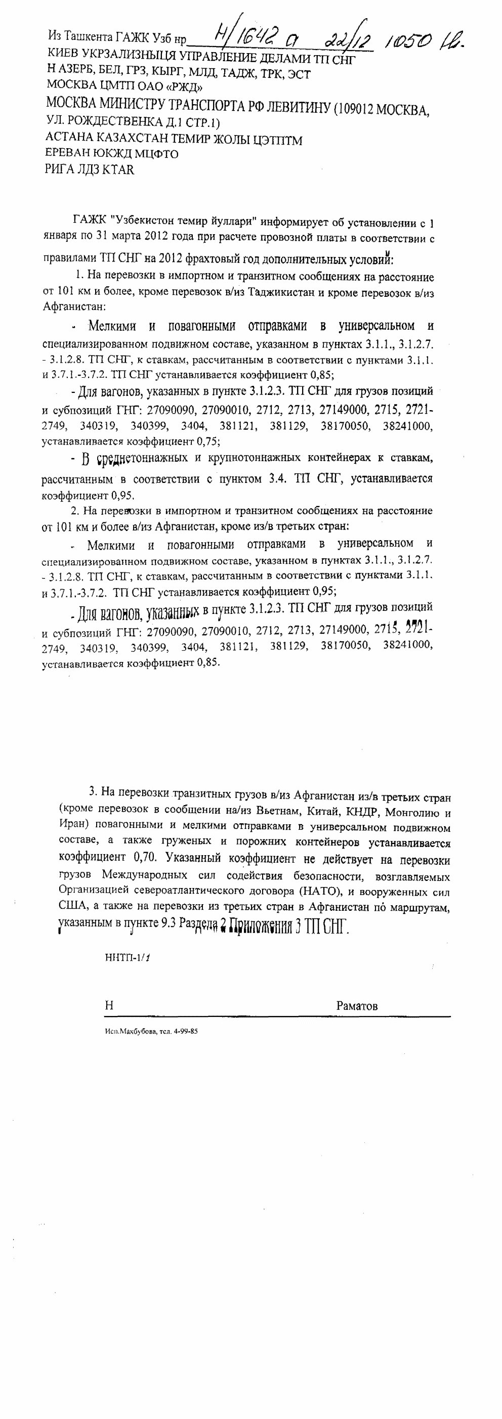 | Из Ташкента ГАЖК Узб нр Н/1642 а 22/12 1050 КИЕВ УКРЗАЛИЗНЫЦЯ УПРАВЛЕНИЕ ДЕЛАМИ ТП СНГ Н АЗЕРБ, БЕЛ, ГРЗ, КЫРГ, МЛД, ТАДЖ, TPК, ЭСТ МОСКВА ЦМТП ОАО «РЖД» МОСКВА МИНИСТРУ ТРАНСПОРТА РФ ЛЕВИТИНУ (109012 МОСКВА, УЛ. РОЖДЕСТВЕНКА Д.1 СТР.1) АСТАНА КАЗАХСТАН ТЕМИР ЖОЛЫ ЦЭТПТМ ЕРЕВАН ЮКЖД МЦФТО