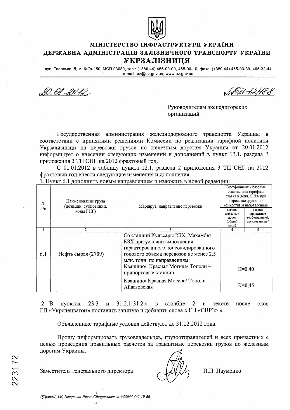 e-mail: uz@uz.gov.ua, www.uz.gov.ua 20.01.2012 № ЦЗМ-12/188 Руководителям экспедиторских организаций Государственная администрация железнодорожного транспорта Украины в соответствии с принятыми решениями Комиссии по реализации тарифной политики Укрзализныци на перевозки грузов по железным дорогам Украины от 20.01.2012 информирует о внесении следующих изменений и дополнений в пункт 12.1. раздела 2 приложения 3ТП СНГ на 2012 фрахтовый год. С 01.01.2012 в таблицу пункта 12 раздела 2 приложения 3 ТП СНГ вносятся следующие дополнения и изменения: 1. Пункт 6.1 дополнить новыми направлениями и изложить в новой редакции: 2.