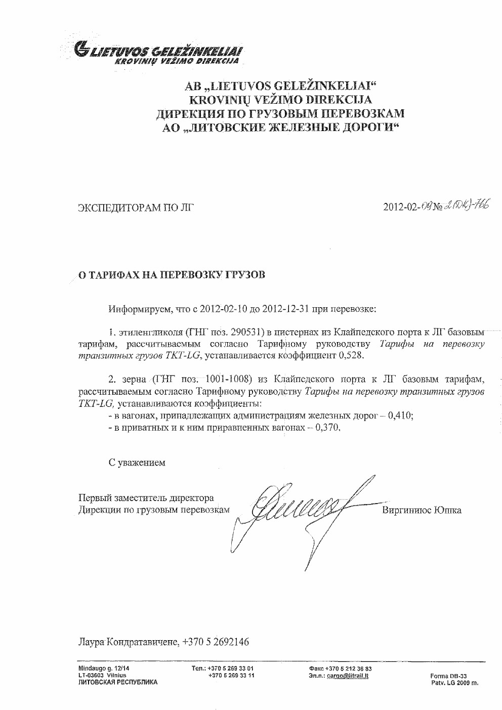 | LIETUVOS GELEŽINKELIAI KROVINIŲ VEZIMO DIREKCIJA AB „LIETUVOS GELEŽINKELIAI" KROVINIŲ VEŽIMO DIREKCIJA ДИРЕКЦИЯ ПО ГРУЗОВЫМ ПЕРЕВОЗКАМ АО „ЛИТОВСКИЕ ЖЕЛЕЗНЫЕ ДОРОГИ" ЭКСПЕДИТОРАМ ПО ЛГ 2012-02-09№2(ДК)-766