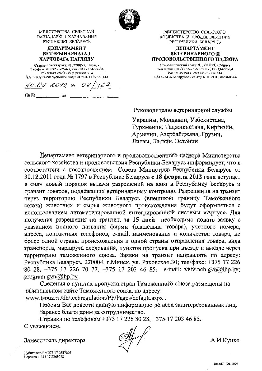 Руководителю ветеринарной службы Украины, Молдавии, Узбекистана, Туркмении, Таджикистана, Киргизии Армении, Азербайджана, Грузии, Литвы, Латвии, Эстонии Департамент ветеринарного и продовольственного надзора Министерства сельского хозяйства и продовольствия Республики Беларусь информирует, что в соответствии с постановлением Совета Министров Республики Беларусь от 30.12.2011 года № 1797 в Республике Беларусь с 18 февраля 2012 года вступает в силу новый порядок выдачи разрешений на ввоз в Республику Беларусь и транзит товаров, подлежащих ветеринарному контролю. Разрешения на транзит через территорию Республики Беларусь (внешнюю границу Таможенного союза) животных и сырья животного происхождения будут оформляться с использованием автоматизированной интегрированной системы «Аргус». Для получения разрешения на транзит, за 15 дней необходимо подать заявку с указанием полного названия фирмы (владельца товара), учетного номера, адреса, контактных телефонов, e-mail, наименования и количества товара, не более одной страны происхождения и одной страны отправления товара, вида транспорта, маршрута следования, пунктов пропуска при въезде и выезде через территорию таможенного союза. Заявки на транзит направлять по адресу: Республика Беларусь, 220004, г.Минск, ул. Раковская 30; тел/факс: +375 17 226 80 28, +375 17 226 70 77, +375 17 203 46 85; e-mail: vetvrach.gvn@ihp.bv; program.gvn@ihp.by . Сведения о пунктах пропуска стран Таможенного союза размещены на официальном сайте Таможенного союза по адресу: www.tsouz.ru/db/techregulation/PP/Pages/default.aspx . Просим Вас довести данную информацию до всех заинтересованных лиц. Заранее благодарим за сотрудничество. Справки по телефонам +375 17 226 80 28, +375 17 203 46 85. С уважением, Заместитель директора А.И.Куцко