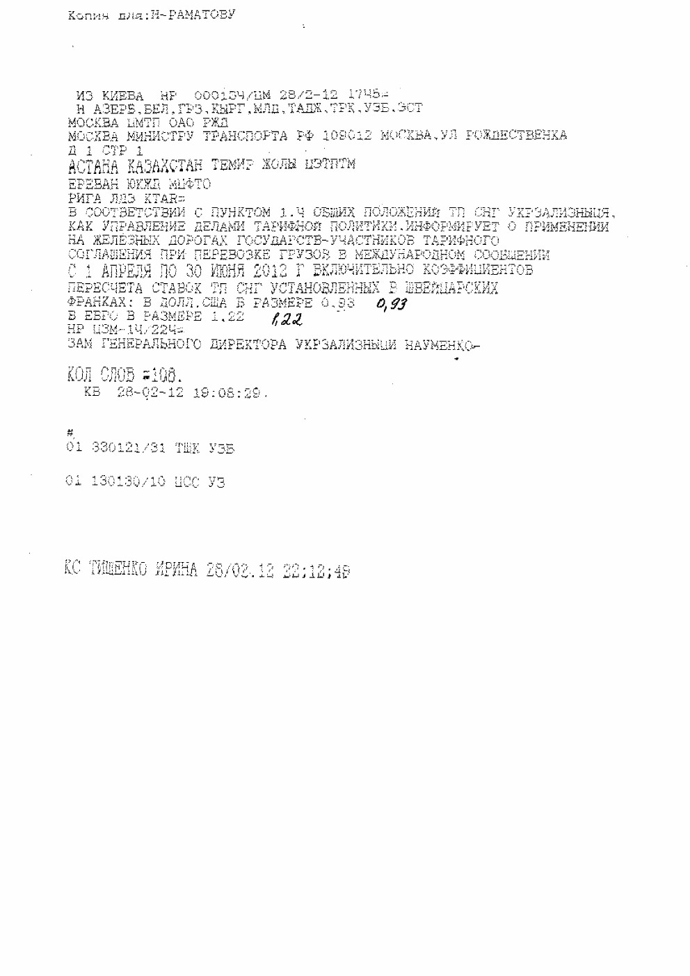 В соответствии с пунктом 1.4 Общих положений ТП СНГ Укрзализныця, как Управление делами Тарифной политики, информирует о применении на Железных дорогах государств-участников Тарифного Соглашения при перевозке грузов в международном сообщении с 1 апреля по 30 июня 2012 г включительно коэффициентов пересчета ставок ТП СНГ установленных в швейцарских франках: в долл. США в размере 0,93; в евро в размере 1,22.