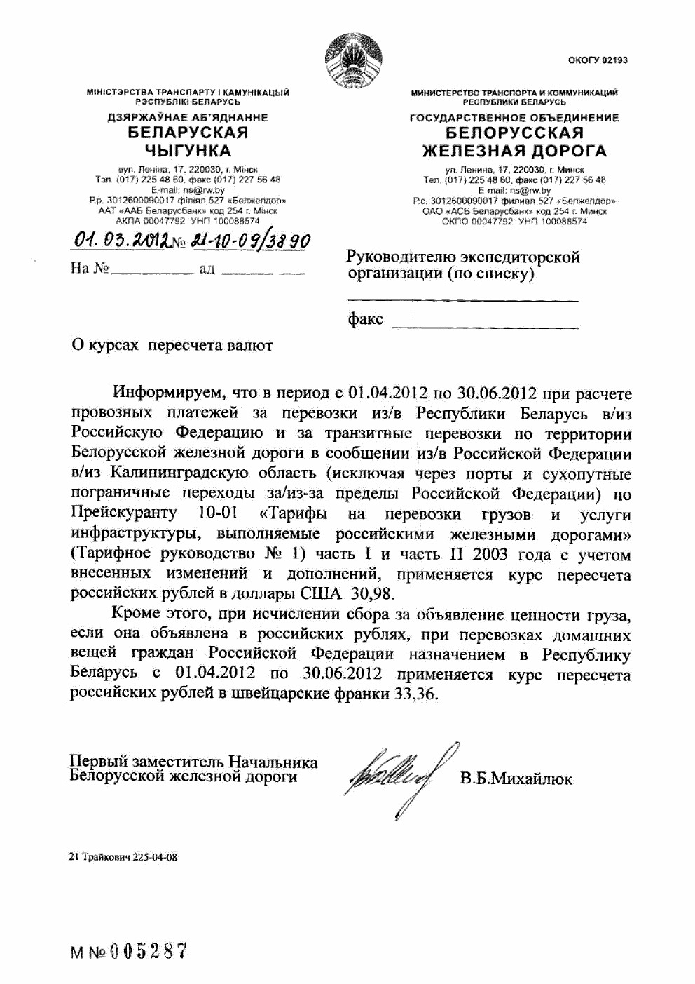 Информируем, что в период с 01.04.2012 по 30.06.2012 при расчете провозных платежей за перевозки из/в Республики Беларусь в/из Российскую Федерацию и за транзитные перевозки по территории Белорусской железной дороги в сообщении из/в Российской Федерации в/из Калининградскую область (исключая через порты и сухопутные пограничные переходы за/из-за пределы Российской Федерации) но Прейскуранту 10-01 «Тарифы на перевозки грузов и услуги инфраструктуры, выполняемые российскими железными дорогами» (Тарифное руководство № 1) часть I и часть П 2003 года с учетом внесенных изменений и дополнений, применяется курс пересчета российских рублей в доллары США 30,98. Кроме этого, при исчислении сбора за объявление ценности груза, если она объявлена в российских рублях, при перевозках домашних вещей граждан Российской Федерации назначением в Республику Беларусь с 01.04.2012 по 30.06.2012 применяется курс пересчета российских рублей в швейцарские франки 33,36.