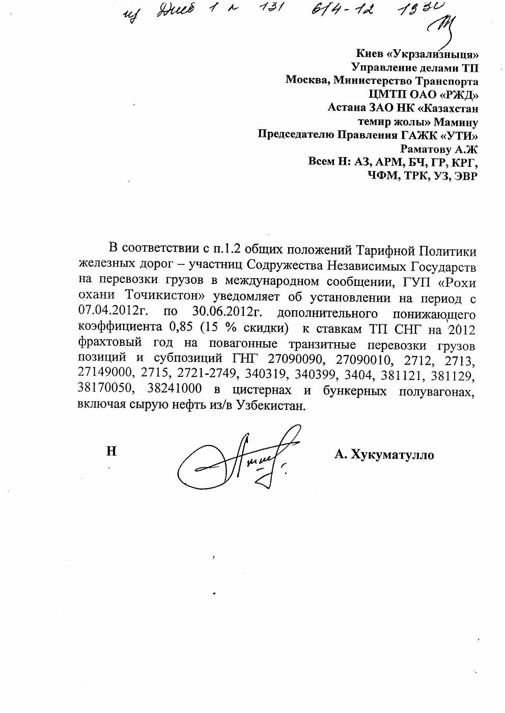 Киев «Укрзализныця» Управление делами ТП Москва, Министерство Транспорта ЦМТП ОАО «РЖД» Астана ЗАО НК «Казахстан темир жолы» Мамину Председателю Правления ГАЖК «УТИ» Раматову А.Ж Всем Н: A3, АРМ, БЧ, ГР, КРГ, ЧФМ, ТРК, УЗ, ЭВР