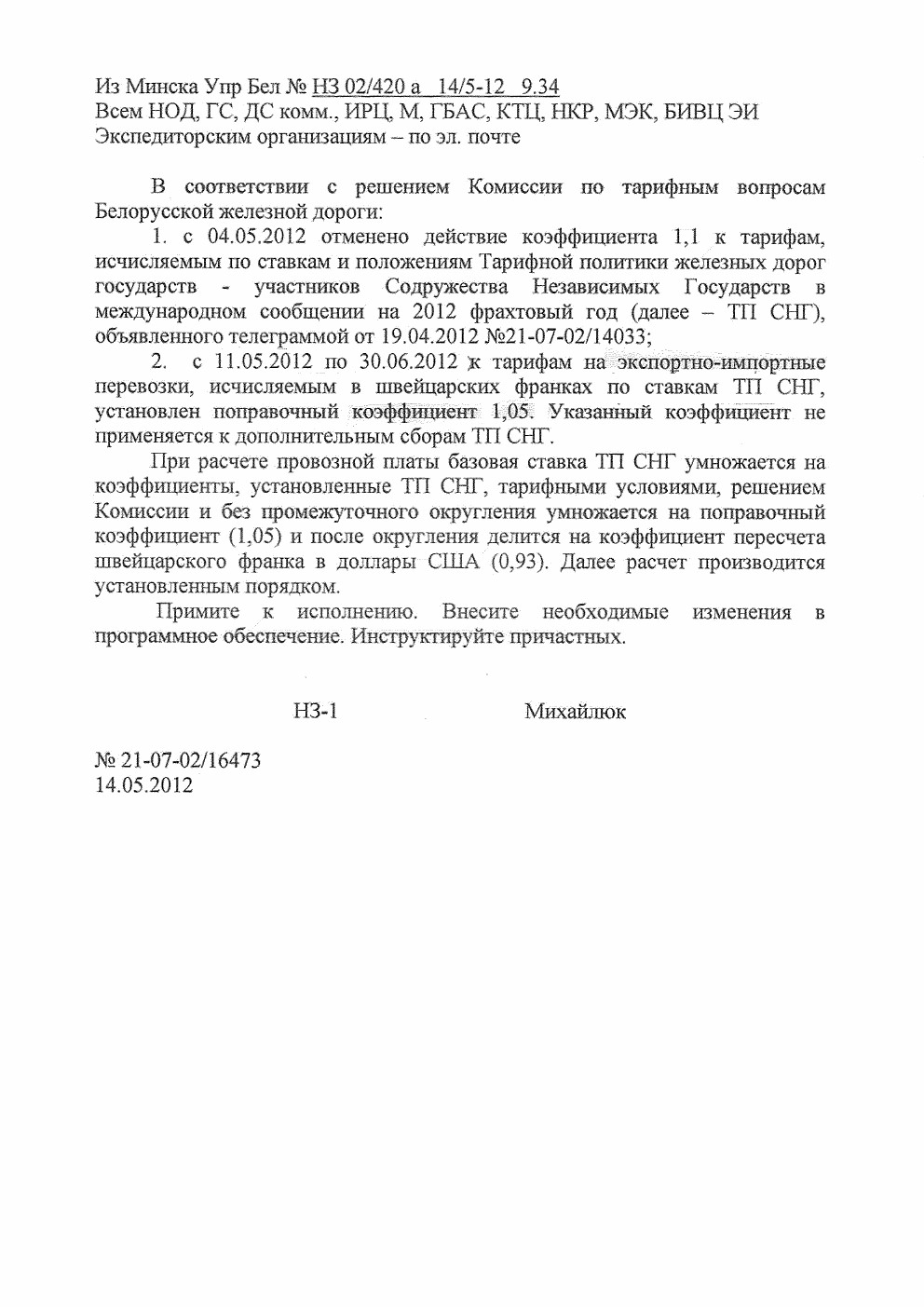 | Из Минска Упр Бел № НЗ 02/420 а 14/5-12 9.34 Всем НОД, ГС, ДС комм., ИРЦ, М, ГБАС, КТЦ, НКР, МЭК, БИВЦ ЭИ Экспедиторским организациям - по эл. почте В соответствии с решением Комиссии по тарифным вопросам Белорусской железной дороги: 1. с 04.05.2012 отменено действие коэффициента 1,1 к тарифам, исчисляемым по ставкам и положениям Тарифной политики железных дорог государств - участников Содружества Независимых Государств в международном сообщении на 2012 фрахтовый год (далее – ТП СНГ), объявленного телеграммой от 19.04.2012 №21-07-02/14033; 2. с 11.05.2012 но 30.06.2012 к тарифам на экспортно-импортные перевозки, исчисляемым в швейцарских франках по ставкам ТП СНГ, установлен поправочный коэффициент 1,05. Указанный коэффициент не применяется к дополнительным сборам ТП СНГ. При расчете провозной платы базовая ставка ТП СНГ умножается на коэффициенты, установленные ТП СНГ, тарифными условиями, решением Комиссии и без промежуточного округления умножается на поправочный коэффициент (1,05) и после округления делится на коэффициент пересчета швейцарского франка в доллары США (0,93). Далее расчет производится установленным порядком. Примите к исполнению. Внесите необходимые изменения в программное обеспечение. Инструктируйте причастных. НЗ-1 Михайлюк №21-07-02/16473 14.05.2012