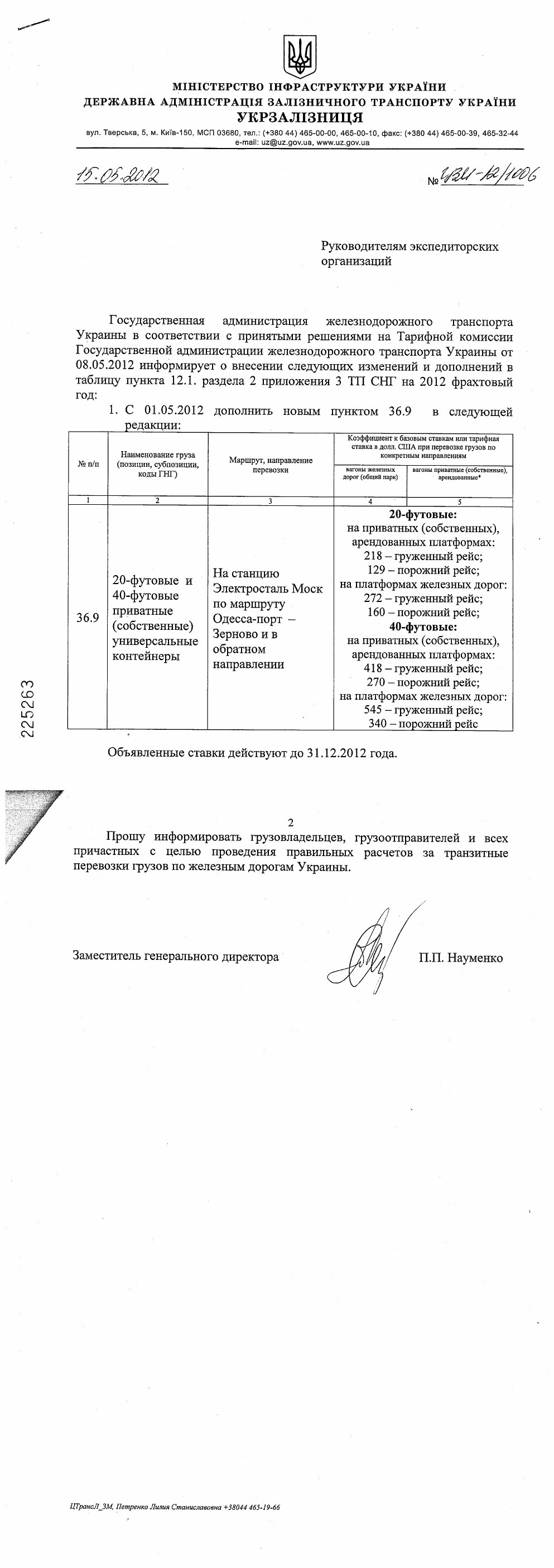 Объявленные ставки действуют до 31.12.2012 года Прошу информировать грузовладельцев, грузоотправителей и всех причастных с целью проведения правильных расчетов на транзитные перевозки грузов по железным дорогам Украины. Заместитель генерального директора П.П. Науменко ЦТрансЛ_ЗМ, Петренко Лилия Станиславовна +38044 465-19-66 | |||||||||||||||||||||