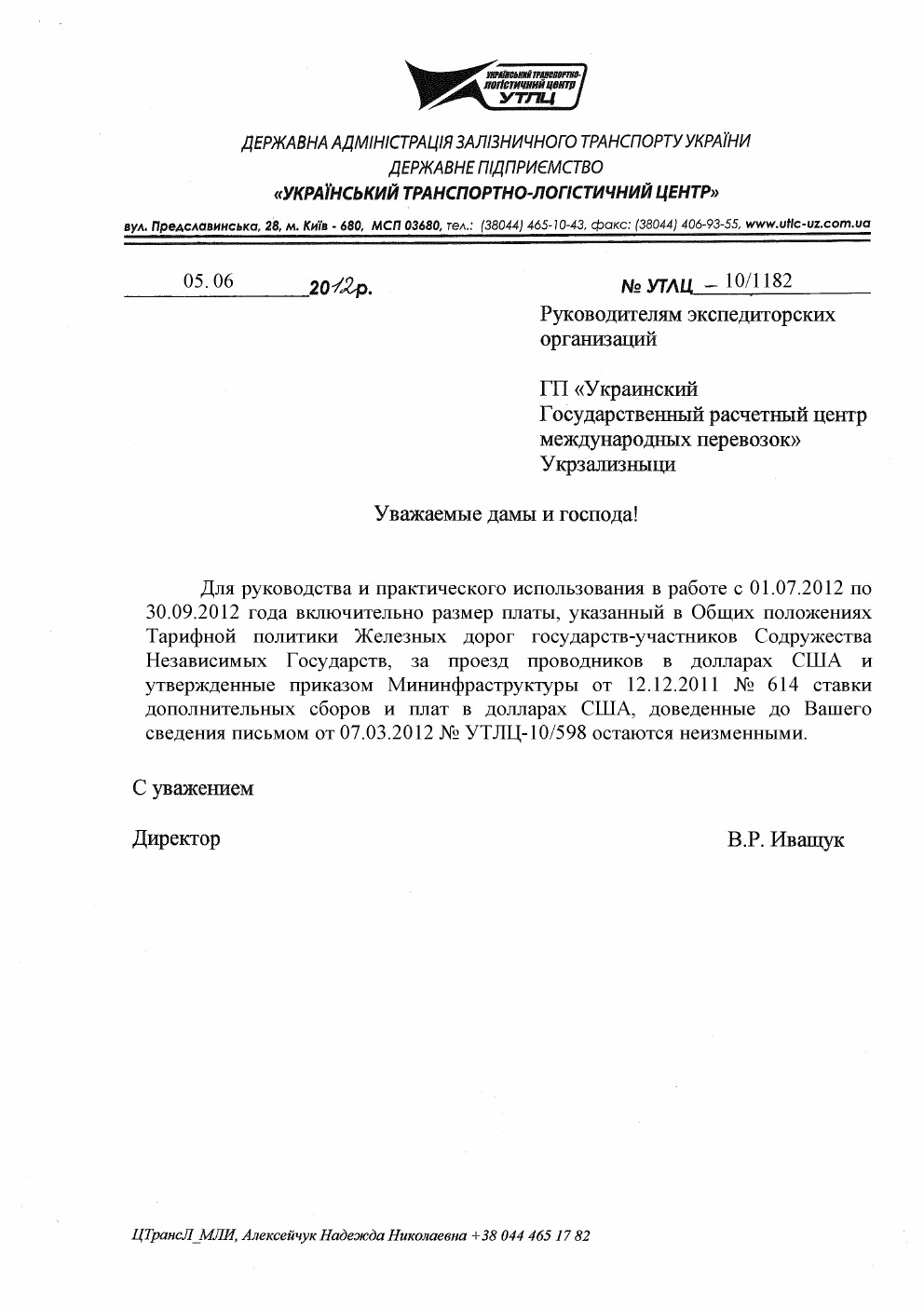 Уважаемые дамы и господа! Для руководства и практического использования в работе с 01.07.2012 по 30.09.2012 года включительно размер платы, указанный в Общих положениях Тарифной политики Железных дорог государств-участников Содружества Независимых Государств, за проезд проводников в долларах США и утвержденные приказом Мининфраструктуры от 12.12.2011 № 614 ставки дополнительных сборов и плат в долларах США, доведенные до Вашего сведения письмом от 07.03.2012 № УТЛЦ-10/598 остаются неизменными.