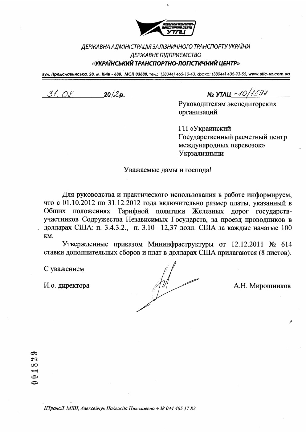 Для руководства и практического использования в работе информируем, что с 01.10.2012 по 31.12.2012 года включительно размер платы, указанный в Общих положениях Тарифной политики Железных дорог государств-участников Содружества Независимых Государств, за проезд проводников в долларах США: п.3.4.3.2., п. 3.10-12,37 долл. США за каждые начатые Утвержденные приказом Мининфраструктуры от 12.12.2011 № 614 ставки дополнительных сборов и плат в долларах США прилагаются (8 листов). С уважением И.о. директора А.Н. Мирошников ЦТрансЛ_МЛИ, Алексейчук Надежда Николаевна +38 044 465 17 82 ЦЗМ-12/1722 от 31.08.2012г.