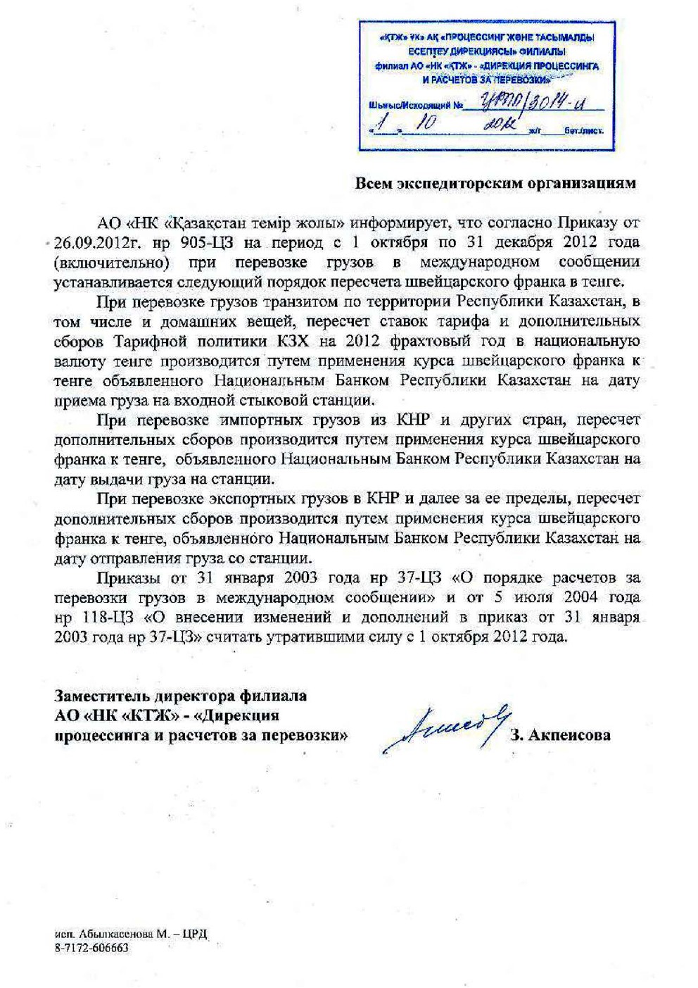 АО «НК «Қазақстан темір жолы» информирует, что согласно Приказу от 26.09.2012г. нр 905-ЦЗ на период с 1 октября по 31 декабря 2012 года (включительно) при перевозке грузов в международном сообщении устанавливается следующий порядок пересчета швейцарского франка в тенге. При перевозке грузов транзитом по территорий Республики Казахстан, в том числе и домашних вещей, пересчет ставок тарифа и дополнительных: сборов Тарифной политики КЗХ на 2012 фрахтовый год в национальную валюту тенге производится путем применения курса швейцарского франка к тенге объявленного Национальным Банком Республики Казахстан на дату приема груза на входной стыковой станции. При перевозке импортных грузов из КНР и других стран, пересчет дополнительных сборов производится путем применения курса швейцарского франка к тенге, объявленного Национальным Банком Республики Казахстан на дату выдачи груза на станции. При перевозке экспортных грузов в КНР и далее за ее пределы, пересчет дополнительных сборов производится путем применения курса швейцарского франка к тенге, объявленного Национальным Банком Республики Казахстан на дату отправления груза со станции. Приказы от 31 января 2003 года нр 37-ЦЗ «О порядке расчетов за перевозки грузов в международном сообщении» и от 5 июля 2004 года нр 118-ЦЗ «О внесении изменений и дополнений в приказ от 31 января 2003 года нр 37-ЦЗ» считать утратившими силу с 1 октября 2012 года.