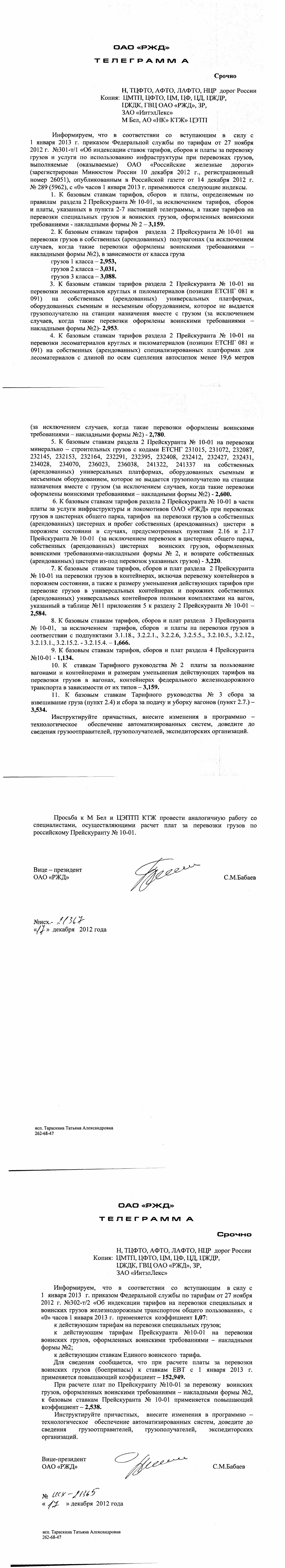 ТЕЛЕГРАММА Срочно Н, ТЦФТО, АФТО, ЛАФТО, НЦР дорог России Копии: ЦМТ, ЦФТО, ЦМ, ЦФ, ЦД, ЦЖДР ЦЖДК, ГВЦ ОАО «РЖД», ЗР, ЗАО «ИнтэлЛекс» М Бел, АО «НК» КТЖ» ЦЭТП Информируем, что в соответствии со вступающим в силу с 1 января 2013 г. приказом Федеральной службы по тарифам от 27 ноября 2012 г. №301-т/1 «Об индексации ставок тарифов, сборов и платы за перевозку грузов и услуги по использованию инфраструктуры при перевозках грузов, выполняемые (оказываемые) ОАО «Российские железные дороги» (зарегистрирован Минюстом России 10 декабря 2012 г., регистрационный номер 26051), опубликованным в Российской газете от 14 декабря 2012 г. № 289 (5962), с «О» часов1 января 2013 г. применяются следующие индексы. 1.К базовым ставкам тарифов, сборов и платы, определяемым по правилам раздела 2 Прейскуранта № 10-01, за исключением тарифов, сборов и платы, указанных в пунктах 2-7 настоящей телеграммы, а также тарифов на перевозки специальных грузов и воинских грузов, оформленных воинскими требованиями - накладными формы № 2- 3,159. 2. К базовым ставкам тарифов раздела 2 Прейскуранта № 10-01 на перевозки грузов в собственных (арендованных) полувагонах (за исключением случаев, когда такие перевозки оформлены воинскими требованиями накладными формы №2), в зависимости от класса груза грузов 1 класса- 2,953, грузов 2 класса- 3,031, грузов 3 класса- 3,088. 3.К базовым ставкам тарифов раздела 2 Прейскуранта № 10-01 на перевозки лесоматериалов круглых и пиломатериалов (позиции ЕТСНГ 081 и 091) на собственных (арендованных) универсальных платформах, оборудованных съемным и несъемным оборудованием, которое не выдается грузополучателю на станции назначения вместе с грузом (за исключением случаев, когда такие перевозки оформлены воинскими требованиями накладными формы №2)- 2,953. 4.К базовым ставкам тарифов раздела 2 Прейскуранта № 10-01 на перевозки лесоматериалов круглых и пиломатериалов (позиции ЕТСНГ 081и 091) на собственных (арендованных) специализированных платформах для лесоматериалов с длиной по осям сцепления автосцепок менее 19,6 метров (за исключением случаев, когда такие перевозки оформлены воинскими требованиями - накладными формы №2) - 2,780. 5. К базовым ставкам раздела 2 Прейскуранта № 10-01 на перевозки минерально - строительных грузов с кодами ЕТСНГ 231015, 231072, 232087, 232145, 232153, 232164, 232291, 232395, 232408, 232412, 232427, 232431, 234028, 234070, 236023, 236038, 241322, 241337 на собственных (арендованных) универсальных платформах, оборудованных съемным и несъемным оборудованием, которое не выдается грузополучателю на станции назначения вместе с грузом (за исключением случаев, когда такие перевозки оформлены воинскими требованиями - накладными формы №2) - 2,600. 6. К базовым ставкам тарифов раздела 2 Прейскуранта № 10-01 в части платы за услуги инфраструктуры и локомотивов ОАО «РЖД» при перевозках грузов в цистернах общего парка, тарифов на перевозки грузов в собственных (арендованных) цистернах и пробег собственных (арендованных) цистерн в порожнем состоянии в случаях, предусмотренных пунктами 2.16 и 2.17 Прейскуранта № 10-01 (за исключением перевозок в цистернах общего парка, собственных (арендованных) цистернах воинских грузов, оформленных воинскими требованиями-накладными формы № 2, и возврате собственных (арендованных) цистерн из-под перевозок указанных грузов) - 3,220. 7. К базовым ставкам тарифов, сборов и плат раздела 2 Прейскуранта № 10-01 на перевозки грузов в контейне