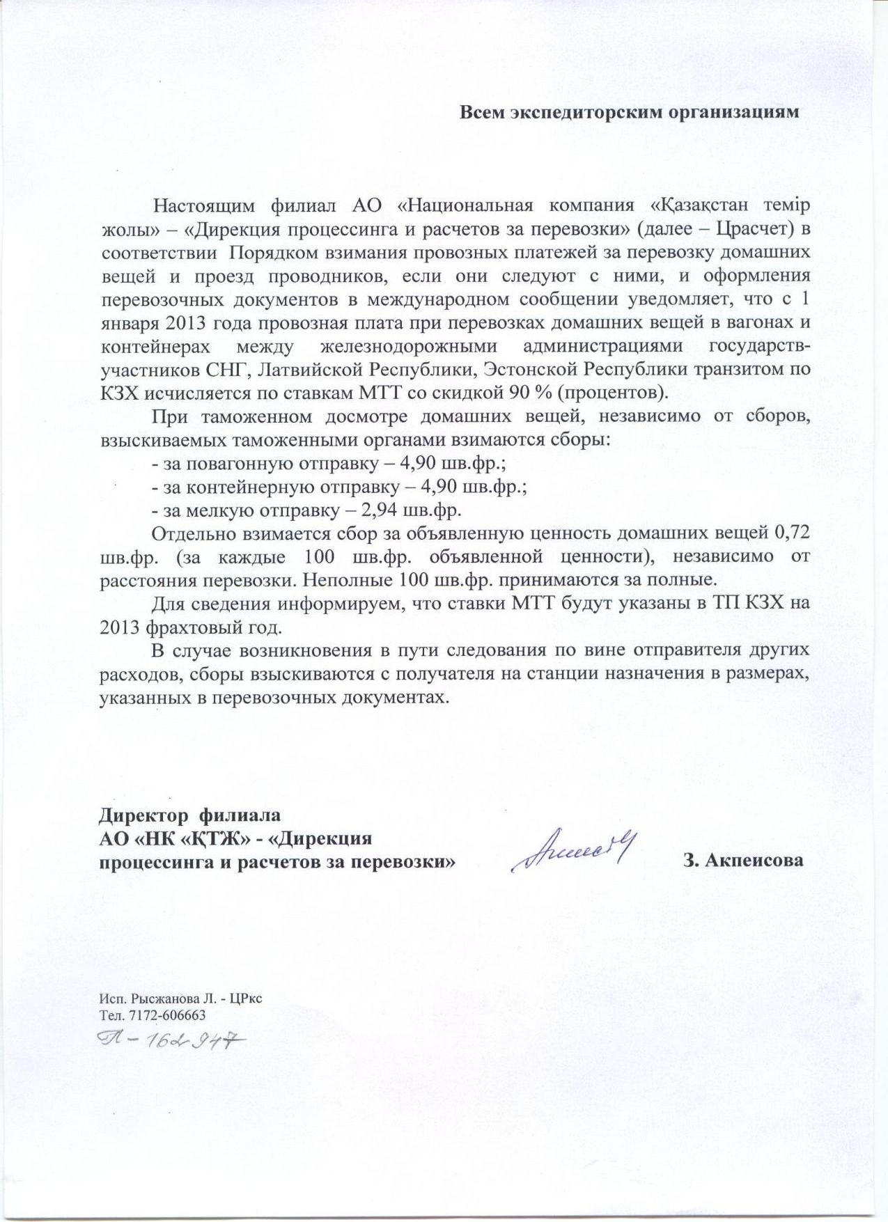 Настоящим филиал АО «Национальная компания «Қазақстан темір жолы» - «Дирекция процессинга и расчетов за перевозки» (далее - Црасчет) в соответствии Порядком взимания провозных платежей за перевозку домашних вещей и проезд проводников, если они следуют с ними, и оформления перевозочных документов в международном сообщении уведомляет, что с 1 января 2013 года провозная плата при перевозках домашних вещей в вагонах и контейнерах между железнодорожными администрациями государств-участников СНГ, Латвийской Республики, Эстонской Республики транзитом по КЗХ исчесляется по ставкам МТТ со скидкой 90% (процентов). При таможенном досмотре домашних вещей, независимо от сборов, взыскиваемых таможенными органами взимаются сборы: - за повагонную отправку- 4,90 шв.фр.; - за контейнерную отправку - 4,90 шв.фр.; - за мелкую отправку - 2,94 шв.фр. Отдельно взимается сбор за объявленную ценность домашних вещей 0,72 шв.фр. (за каждые 100 шв.фр. объявленной ценности), независимо от расстояния перевозки. Неполные 100 шв.фр. принимаются за полные. Для сведения информируем, что ставки МТТ будут указаны в ТП КЗХ на 2012 фрахтовый год. В случае возникновения в пути следования по вине отправителя других расходов, сборы взыскиваются с получателя на станции назначения в размерах, указанных в перевозочных документах. Директор филиала АО «НК «ҚТЖ»- «Дирекция процесинга и расчетов за перевозки» З. Акпеисова Исп. Рысжанова Л. – ЦРкс Тел. 7172-606663 |