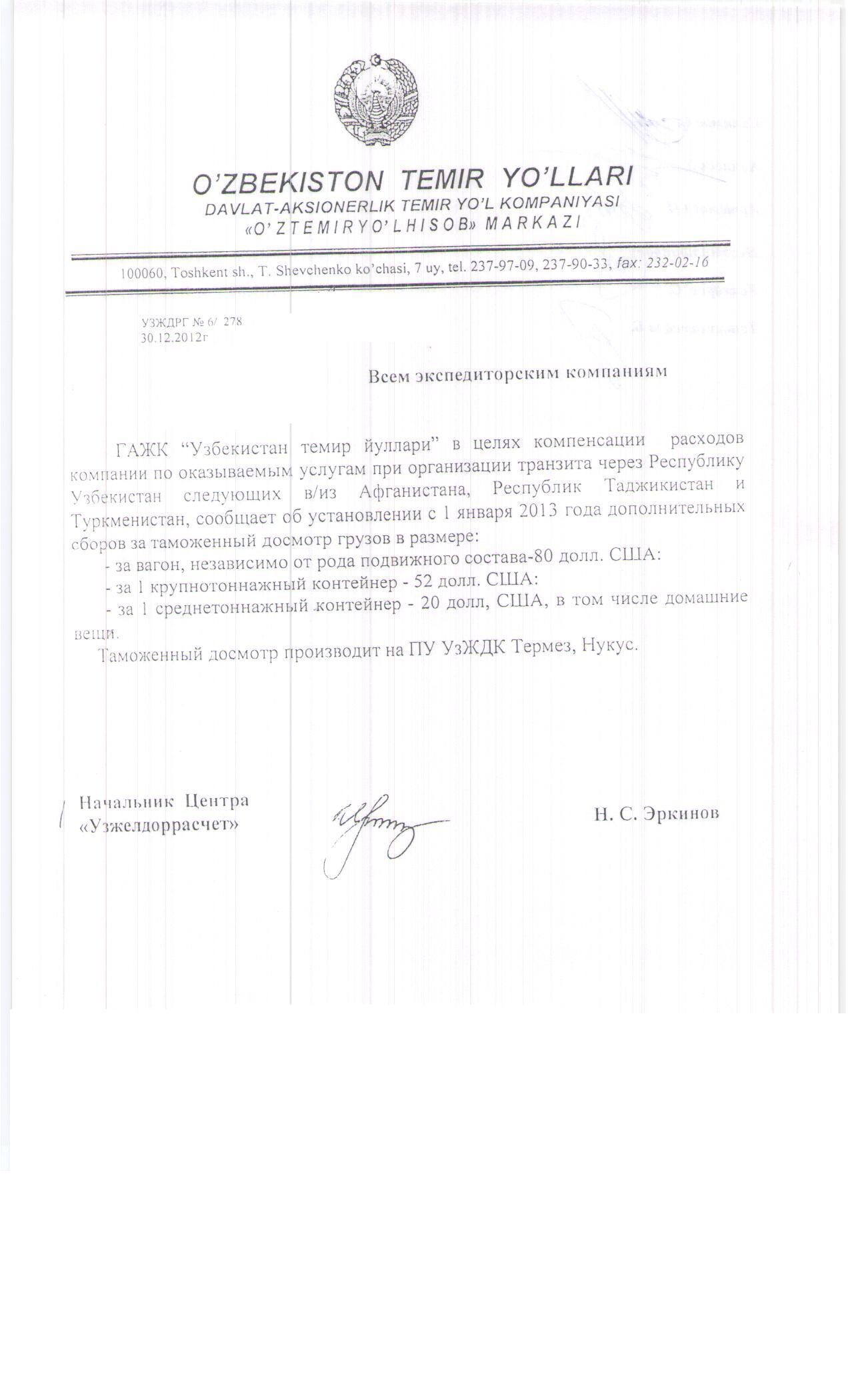 100060, Toshkent sh. T. Shevchenko ko'chasi,7 uy, tel. 237-97-09, 237-90-33,fax:232-02-16 УЗЖДРГ №6/ 278 30.12.2012г. Всем экспедиторским компаниям ГАЖК «Узбекистан темир йуллари» в целях компенсации расходов компании по оказываемым услугам при организации транзита через Республику Узбекистан следующих в/из Афганистана, Республик Таджикистан и Туркменистан, сообщает об установлении с 1 января 2013 года дополнительных сборов за таможенный досмотр грузов в размере: - за вагон, независимо от рода подвижного состава - 80 долл. США: - за 1 крупнотоннажный контейнер – 52 долл. США: - за 1 среднетоннажный контейнер – 20 долл. США, в том числе домашние вещи Таможенный досмотр производит на ПУ УзЖДК Термез, Нукус.