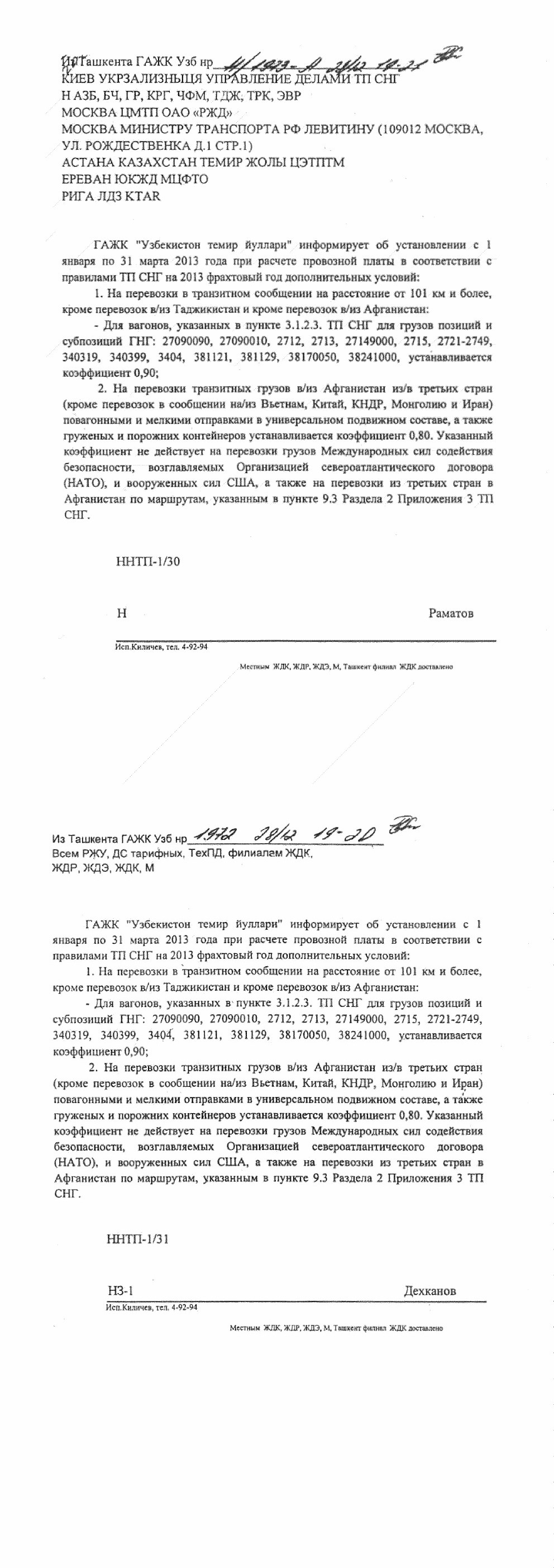 | Из Ташкента ГАЖК Узб нр 1972/ 28/12 19-20 Всем РЖУ, ДС тарифных, ТехПД, филиалам ЖДК, ЖДР, ЖДЭ, ЖДК, М ГАЖК "Узбекистон темир йуллари" информирует об установлении с 1 января по 31 марта 2013 года при расчете провозной платы в соответствии с правилами ТП СНГ на 2013 фрахтовый год дополнительных условий: 1. На перевозки в транзитном сообщении на расстояние от 101 км и более, кроме перевозок в/из Таджикистан и кроме перевозок в/из Афганистан; -Для вагонов, указанных в пункте 3.1.2.3. ТП СНГ для грузов позиций и субпозиций ГНГ: 27090090, 27090010, 2712, 2713, 27149000, 2715, 2721-2749, 340319, 340399, 3404, 381121, 381129, 38170050, 38241000,устанавливается коэффициент 0,90 2. На перевозки транзитных грузов в/из Афганистан из/в третьих стран (кроме перевозок в сообщении на/из Вьетнам, Китай, КНДР, Монголию и Иран) повагонными и мелкими отправками в универсальном подвижном составе, а также груженых и порожних контейнеров устанавливается коэффициент 0,80. Указанный коэффициент не действует на перевозки грузов Международных сил содействия безопасности, возглавляемых Организацией североатлантического договора (НАТО), и вооруженных сил США, а также на перевозки из третьих стран в Афганистан по маршрутам, указанным в пункте 9.3 Раздела 2 Приложения З ТП СНГ ННТП-1/31 НЗ-1 Дехканов Исп.Киличев, тел. 4-92-94 Из Ташкента ГАЖК Узб нр Н/11973 а 28/12 19-21 КИЕВ УКРЗАЛИЗНЫЦЯ УПРАВЛЕНИЕ ДЕЛАМИ ТП СНГ Н АЗБ, БЧ, ГР, КРГ, ЧФМ, ТДЖ, TPК, ЭВР МОСКВА ЦМТП ОАО «РЖД» МОСКВА МИНИСТРУ ТРАНСПОРТА РФ ЛЕВИТИНУ (109012 МОСКВА, УЛ. РОЖДЕСТВЕНКА Д.1 СТР.1) АСТАНА КАЗАХСТАН ТЕМИР ЖОЛЫ ЦЭТПТМ ЕРЕВАН ЮКЖД МЦФТО ГАЖК "Узбекистон темир йуллари" информирует об установлении с 1 января по 31 марта 2013 года при расчете провозной платы в соответствии с правилами ТП СНГ на 2013 фрахтовый год дополнительных условий: 3. На перевозки в транзитном сообщении на расстояние от 101 км и более, кроме перевозок в/из Таджикистан и кроме перевозок в/из Афганистан; -Для вагонов, указанных в пункте 3.1.2.3. ТП СНГ для грузов позиций и субпозиций ГНГ: 27090090, 27090010, 2712, 2713, 27149000, 2715, 2721-2749, 340319, 340399, 3404, 381121, 381129, 38170050, 38241000,устанавливается коэффициент 0,90 4. На перевозки транзитных грузов в/из Афганистан из/в третьих стран (кроме перевозок в сообщении на/из Вьетнам, Китай, КНДР, Монголию и Иран) повагонными и мелкими отправками в универсальном подвижном составе, а также груженых и порожних контейнеров устанавливается коэффициент 0,80. Указанный коэффициент не действует на перевозки грузов Международных сил содействия безопасности, возглавляемых Организацией североатлантического договора (НАТО), и вооруженных сил США, а также на перевозки из третьих стран в Афганистан по маршрутам, указанным в пункте 9.3 Раздела 2 Приложения З ТП СНГ ННТП-1/30 Н Раматов Исп.Киличев, тел. 4-92-94 |