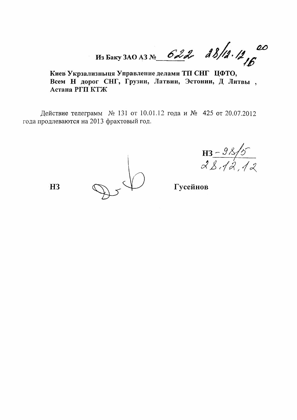 | Из Баку ЗАО АЗ № 622 28/12-12 16:00 Киев Укрзализныця Управление делами ТП СНГ ЦФТО, Всем Н дорог СНГ, Грузии, Латвии, Эстонии, Д Литвы, Астана РГП КТЖ Действие телеграмм № 131 от 10.01.12 года № 425 от 20.07.2012 года продлеваются на 2013 фрахтовый год. НЗ- 98/5 28.12.12