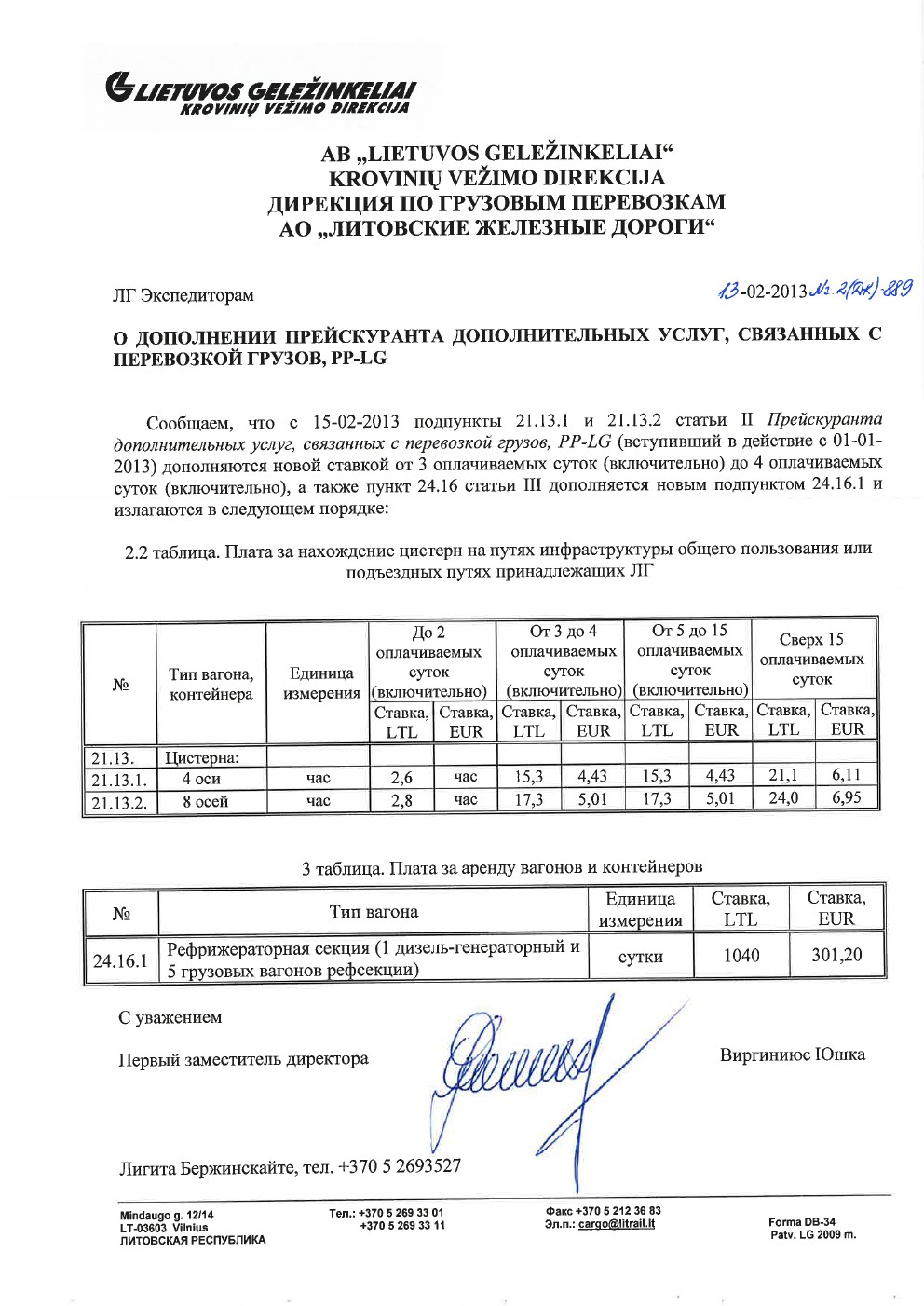 AB „LIETUVOS GELEŽINKELIAI" KROVINIŲ VEŽIMO DIREKCIJA ДИРЕКЦИЯ ПО ГРУЗОВЫМ ПЕРЕВОЗКАМ АО „ЛИТОВСКИЕ ЖЕЛЕЗНЫЕ ДОРОГИ“ ЛГ Экспедиторам 13.02.2013 №2(ДК)-889 О ДОПОЛНЕНИИ ПРЕЙСКУРАНТА дополнительных услуг, связанных с ПЕРЕВОЗКОЙ ГРУЗОВ, PP-LG Сообщаем, что с 15-02-2013 подпункты 21.13.1 и 21.13.2 статьи II Прейскуранта дополнительных услуг, связанных с перевозкой грузов, PP-LG (вступивший в действие с 01-01- 2013) дополняются новой ставкой от 3 оплачиваемых суток (включительно) до 4 оплачиваемых суток (включительно), а также пункт 24.16 статьи III дополняется новым подпунктом 24.16.1 и излагаются в следующем порядке: 2.2 таблица. Плата за нахождение цистерн на путях инфраструктуры общего пользования или подъездных путях принадлежащих ЛГ
