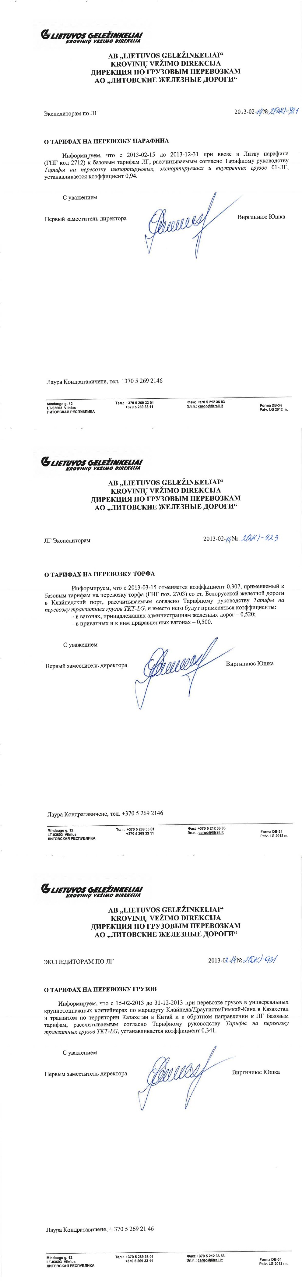 ЛГ Экспедиторам 2013-02-14 № 2 (ДК)-923 Информируем, что с 2013-03-15 отменяется коэффициент 0,307, применяемый к базовым тарифам на перевозку торфа (ГНГ поз. 2703) со ст. Белорусской железной дороги в Клайпедский порт, рассчитываемым согласно Тарифному руководству Тарифы на перевозку транзитных грузов TKT-LG, и вместо него будут применяться коэффициенты: - в вагонах, принадлежащих администрациям железных дорог - 0,520; - в приватных и к ним приравненных вагонах - 0,500. С уважением Первый заместитель директора Виргиниюс Юшка Лаура Кондратавичиене, + 370 5 269 21 46