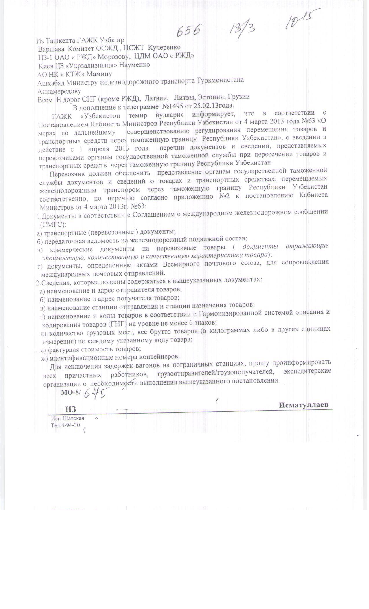 | 656 18/3 1015 Из Ташкента ГАЖК Узбк нр Варшава Комитет ОСЖД, ЦСЖТ Кучеренко ЦЗ-1 ОАО «РЖД» Морозову, ЦДМ ОАО «РЖД» Киев ЦЗ «Укрзализныця» Науменко АО НК «КТЖ» Мамину Ашхабад Министру железнодорожного транспорта Туркменистана Аннамередову Всем Н дорог СНГ (кроме РЖД), Латвии, Литвы, Эстонии, Грузии В дополнение к телеграмме №1495 от 25.02.13 года. ГАЖК «Узбекистон темир йуллари» информирует, что в соответствии с Постановлением Кабинета Министров Республики Узбекистан от 4 марта 2013 года № 63 «О мерах по дальнейшему совершенствованию регулирования перемещения товаров и транспортных средств через таможенную границу Республики Узбекистан» о введении в действие с 1 апреля 2013 года перечни документов и сведений, предоставляемых перевозчиками органам государственной таможенной службы при пересечении товаров и транспортных средств через таможенную границу республики Узбекистан. Перевозчик должен обеспечить предоставление органам государственной таможенной службы документов и сведений о товарах и транспортных средствах, перемещаемых железнодорожным транспортом через таможенную границу Республики Узбекистан соответственно, по перечню согласно приложению №2 к постановлению Кабинета Министров от 4 марта 2013 года № 63: 1. Документы в соответствии с Соглашением о международном железнодорожном грузовом сообщении (СМГС): а) транспортные (перевозочные) документы; б) передаточная ведомость на железнодорожный подвижной состав; в) коммерческие документы на перевозимые товары (документы, отражающие стоимостную, количественную и качественную характеристику товара); г) документы, определенные актами Всемирного почтового союза, для сопровождения международных почтовых отправлений. 2. Сведения, которые должны содержаться в вышеуказанных документах: а) наименование и адрес отправителя товаров; б) наименование и адрес получателя товаров; в) наименование станции отправления и станции назначения товаров; г) наименование и коды товаров в соответствии с Гармонизированной системой описания и кодирования товаров на уровне не менее 6 знаков; д) количество грузовых мест, вес брутто товаров (в килограммах либо в других единицах измерения) по каждому указанному коду товара; е) фактурная стоимость товаров; ж) идентификационные номера контейнеров. МО-8/675 НЗ Исматуллаев Исп. Шатская Тел 4-94-30 |