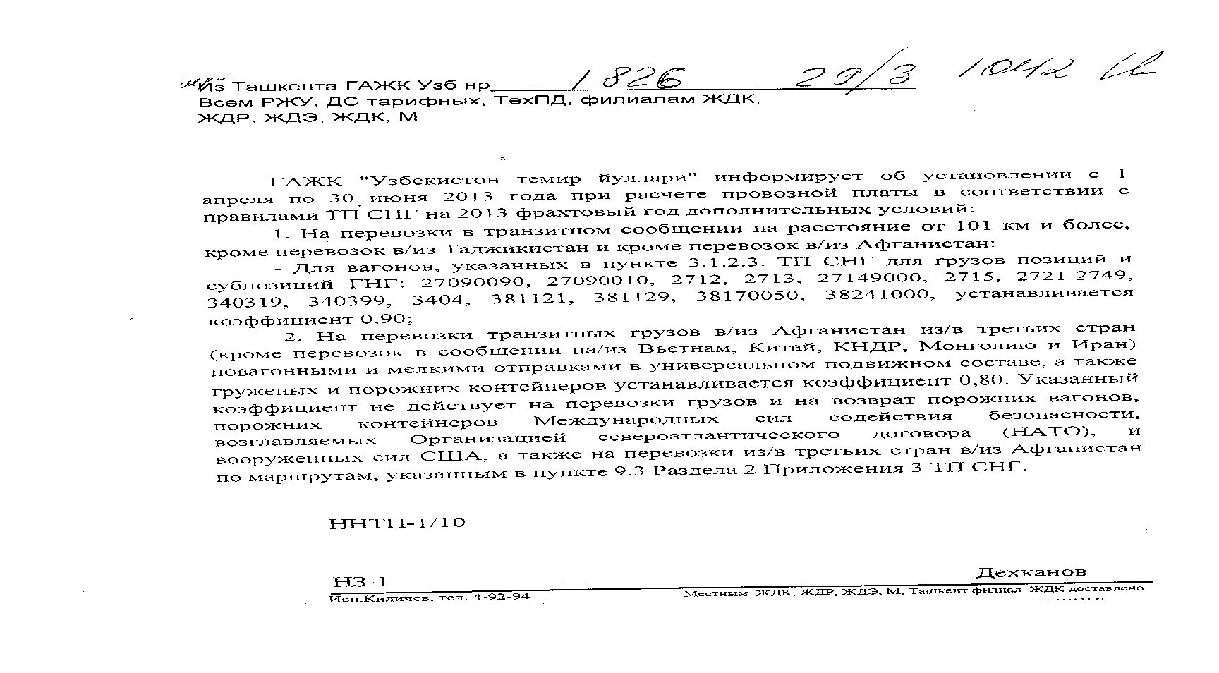 | Из Ташкента ГАЖК Узб нр 826 29/3 1042 Всем РЖУ, ДС, тарифных, ТехПД, филиалам ЖДК, ЖДР, ЖДЭ, ЖДК, М ГАЖК «Узбекистон темир йуллари» информирует об установлении с 1 апреля по 30 июня 2013 года при расчете провозной платы в соответствии с правилами ТП СНГ на 2013 фрахтовый год дополнительных условий: