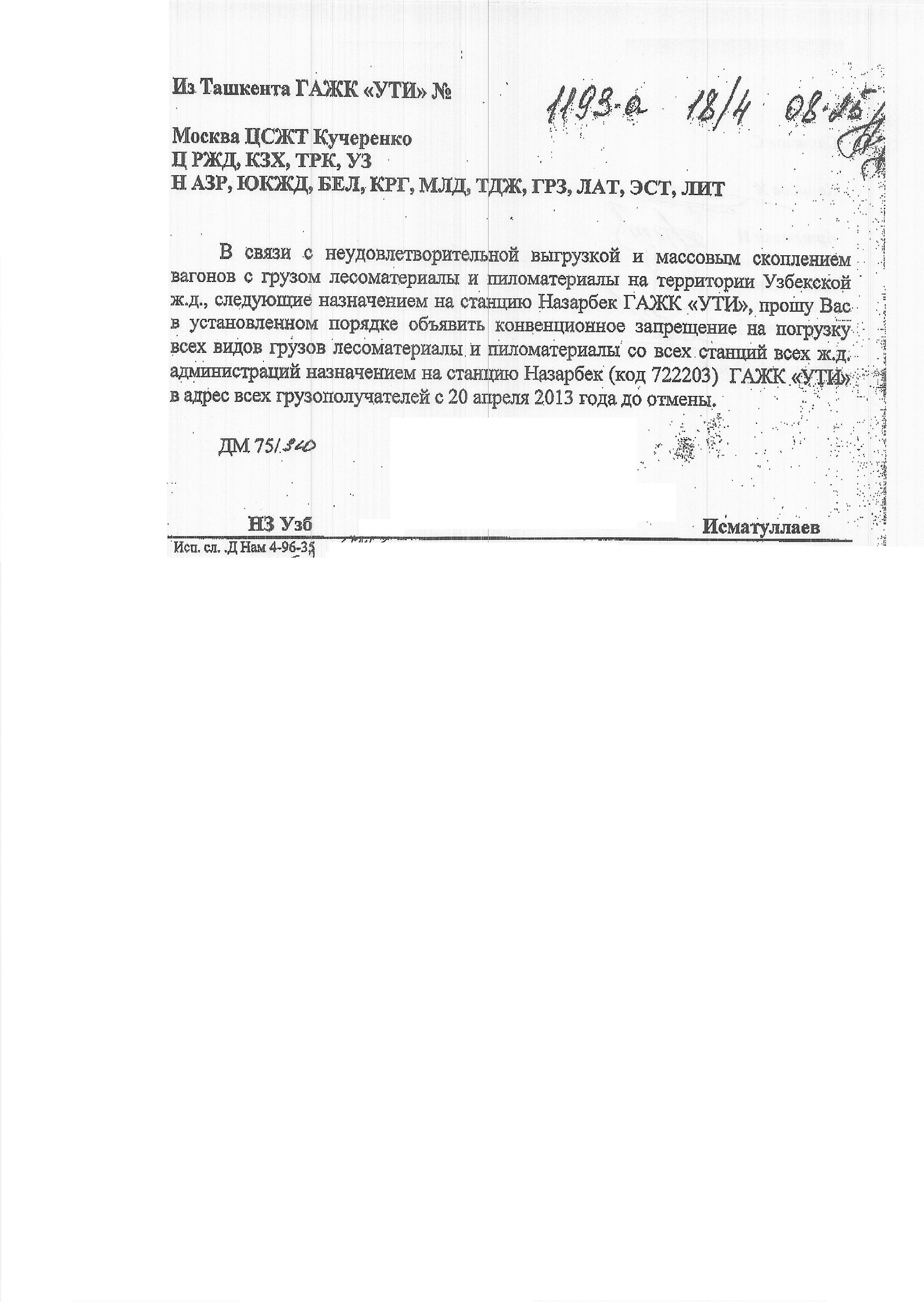 | Из Ташкента ГАЖК «УТИ» № 1193-а 184 08:25 Москва ЦСЖТ Кучеренко Ц РЖД, КЗХ, ТРК, УЗ Н АЗР, ЮКЖД, БЕЛ, КРГ, МЛД, ТДЖ, ГРЗ, ЛАТ, ЭСТ, ЛИТ В связи с неудовлетворительной выгрузкой и массовым скоплением вагонов с грузом лесоматериалы и пиломатериалы на территории Узбекской ж.д., следующие на станцию Назарбек ГАЖК «УТИ», прошу Вас в установленном порядке объявить конвенционное запрещение на погрузку всех видов грузов лесоматериалы и пиломатериалы со всех станций всех ж.д. администраций назначением на станцию Назарбек (код 722203) ГАЖК «УТИ» в адрес всех грузополучателей с 20 апреля 2013 года до отмены.