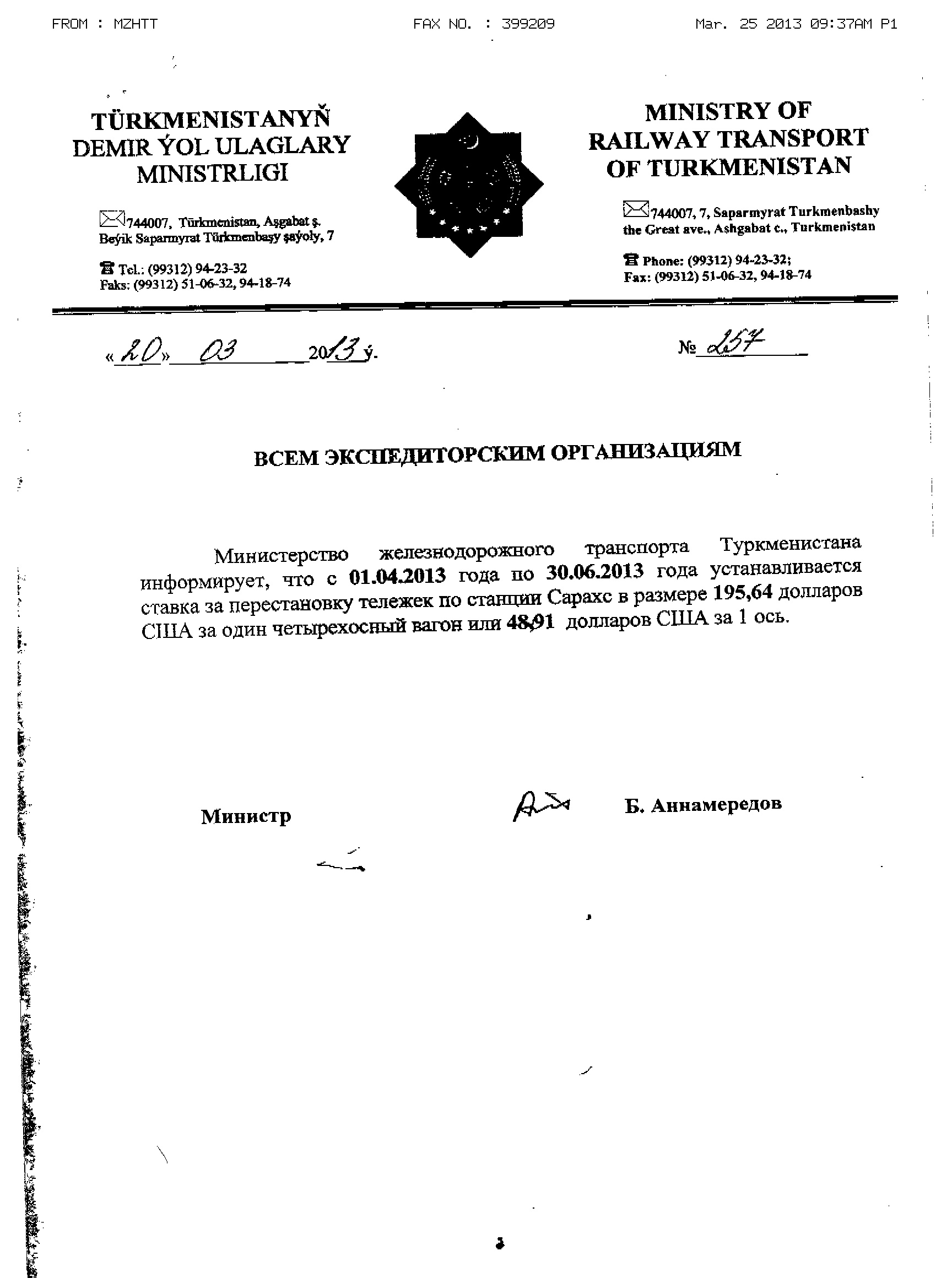 «20» 03. 2013г. № 257 ВСЕМ ЭКСПЕДИТОРСКИМ ОРГАНИЗАЦИЯМ Министерство железнодорожного транспорта Туркменистана информирует, что с 01.04.2013 года по 30.06.2013 года устанавливается ставка за перестановку тележек по станции Сарахс в размере 195,64 долларов США за один четырехосный вагон или 48,91 долларов США за 1 ось.