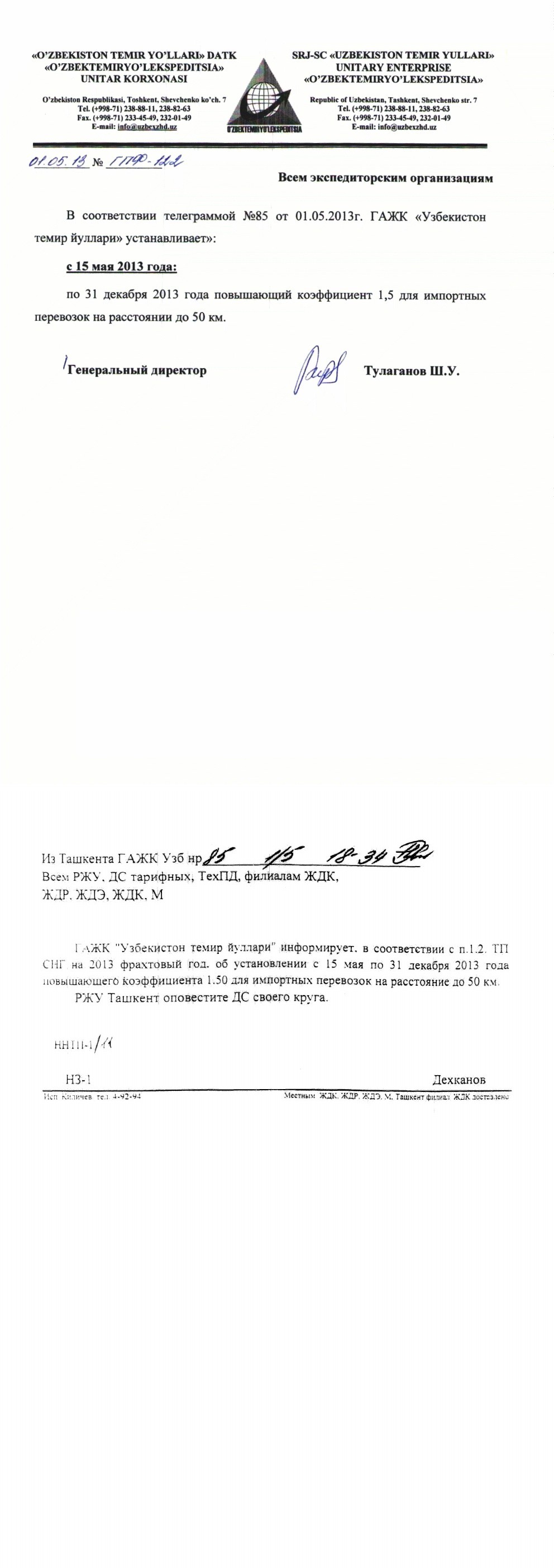 01.05.2013 № ГПФ-122 Всем экспедиторским организациям В соответствии телеграммой №85 от 01.05.2013г. ГАЖК «Узбекистон темир йуллари» устанавливает: с 15 мая 2013 года: По 31 декабря 2013 года повышающий коэффициент 1,5 для импортных перевозок на расстояния до 50 км. Генеральный директор Тулаганов Ш.У. Из Ташкента ГАЖК Узб нр 85 1/5 18-34 Всем РЖУ, ДС тарифных. ТехПД, филиалам ЖДК, ЖДР, ЖДЭ, ЖДК, М ГАЖК «Узбекистон темир йуллари» информирует, в соответствии с п.1.2. ТП СНГ на 2013 фрахтовый год об установлении с 15 мая по 31 декабря 2013 года повышающего коэффициента 1,50 для импортных перевозок на расстояние до 50км. РЖУ Ташкент оповестите ДС своего круга. ННПМ/11 НЗ-1 Дехканов Исп. Киличев тел.4-92-94 Местным ЖДК, ЖДР, ЖДЭ, М, Ташкент филиал ЖДК доставлено |