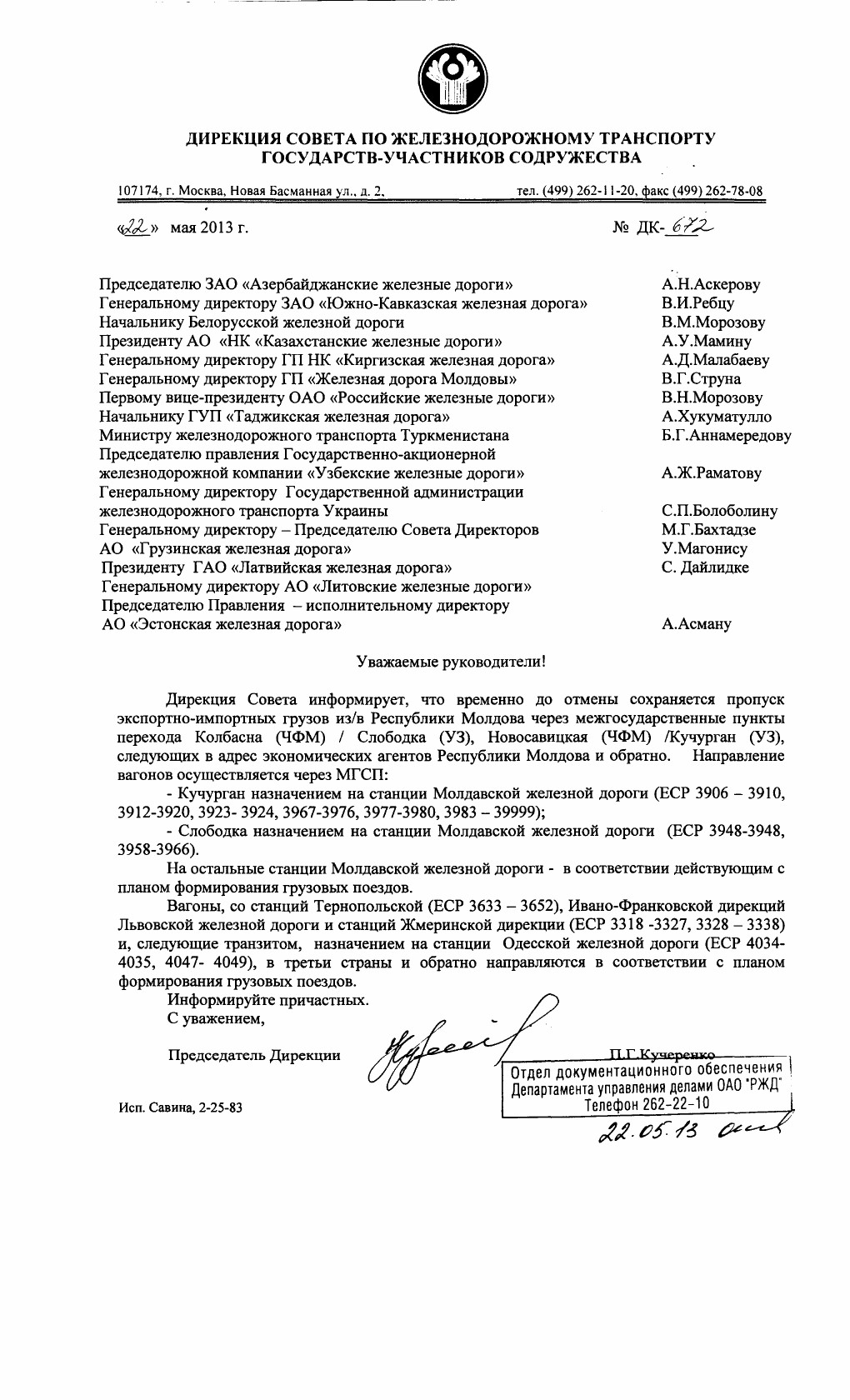 Уважаемые руководители! Дирекция Совета информирует, что временно до отмены сохраняется пропуск экспортно-импортных грузов из/в Республики Молдова через межгосударственные пункты перехода Колбасна (ЧФМ) / Слободка (УЗ), Новосавицкая (ЧФМ) /Кучурган (УЗ), следующих в адрес экономических агентов Республики Молдова и обратно. Направление вагонов осуществляется через МГСП: - Кучурган назначением на станции Молдавской железной дороги (ЕСР 3906 - 3910, 3912-3920, 3923- 3924, 3967-3976, 3977-3980, 3983 - 39999); - Слободка назначением на станции Молдавской железной дороги (ЕСР 3948-3948, 3958-3966). На остальные станции Молдавской железной дороги - в соответствии действующим с планом формирования грузовых поездов. Вагоны, со станций Тернопольской (ЕСР 3633 - 3652), Ивано-Франковской дирекций Львовской железной дороги и станций Жмеринской дирекции (ЕСР 3318 -3327, 3328 - 3338) и, следующие транзитом, назначением на станции Одесской железной дороги (ЕСР 4034-4035, 4047- 4049), в третьи страны и обратно направляются в соответствии с планом формирования грузовых поездов. Информируйте причастных. С уважением, Председатель Дирекции П.Г. Кучеренко Исп. Савина, 2-25-83