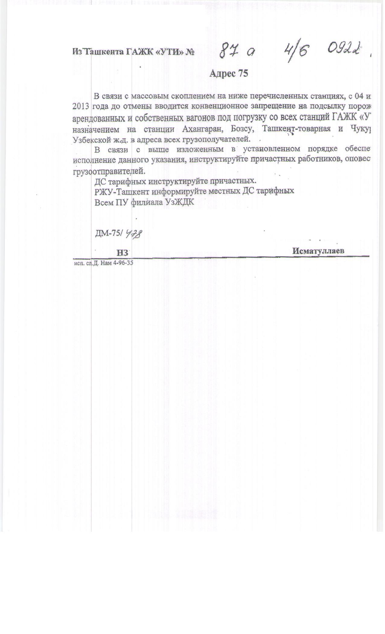| Из Ташкента ГАЖК «УТИ» № 87 а 4/6 0922 Адрес 75 В связи с массовым скоплением на ниже перечисленных станциях, с 04 июня 2013 года до отмены вводится конвенционное запрещение на подсылку порожних арендованных и собственных вагонов под погрузку со всех станций ГАЖК «УТИ» назначением на станции Ахангаран, Бозсу, Ташкент-товарная и Чукурсай, Узбекской ж.д. в адреса всех грузополучателей. В связи с выше изложенным в установленном порядке обеспечить исполнение данного указания, инструктируйте причастных работников, оповестите грузоотправителей. ДС тарифных инструктируйте причастных. РЖУ- Ташкент информируйте местных ДС тарифных Всем ПУ филиала УзЖДК ДМ-75/478 НЗ Исматуллаев Исп.сл.Д Нам 4-96-35 |