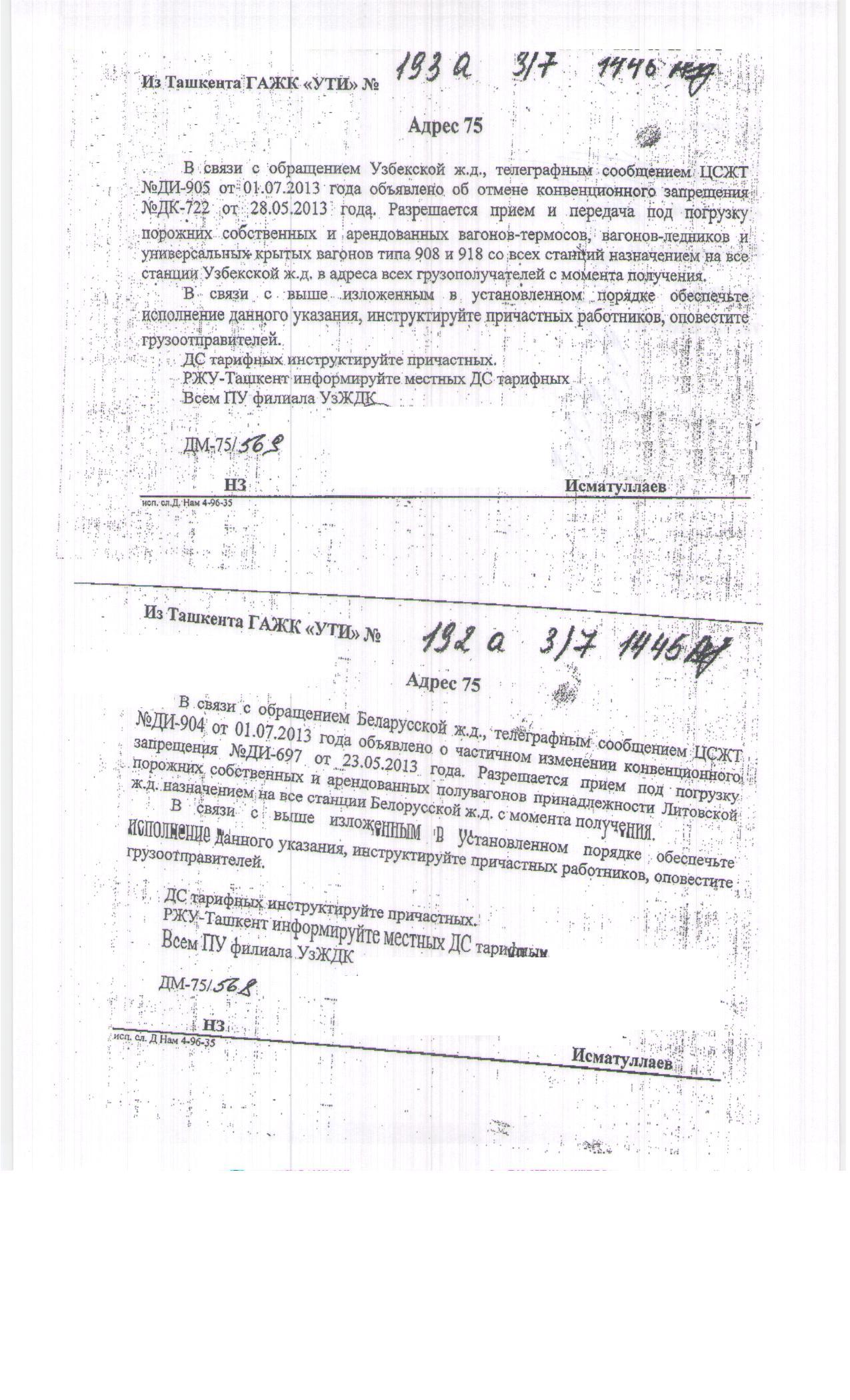 Адрес 75 В связи с обращением Узбекской ж.д., телеграфным сообщением ЦСЖТ №ДИ-905 от 01.07.2013 года объявлено об отмене конвенционного запрещения №ДК-722 от 28.05.2013 года, Разрешается прием и передача под погрузку порожних собственных и арендованных вагонов-термосов, вагонов-ледников и универсальных крытых вагонов типа 908 и918 со всех станций назначением на все станции Узбекской ж.д. в адреса всех грузополучателей с момента получения. В связи с выше изложенным в установленном порядке обеспечьте исполнение данного указания, инструктируйте причастных работников, оповестите грузоотправителей. ДС тарифных инструктируйте причастных. РЖУ- Ташкент информируйте местных ДС тарифных Всем ПУ филиала УзЖДК ДМ-75/569 НЗ Исматуллаев Исп.сл.Д Нам 4-96-35
