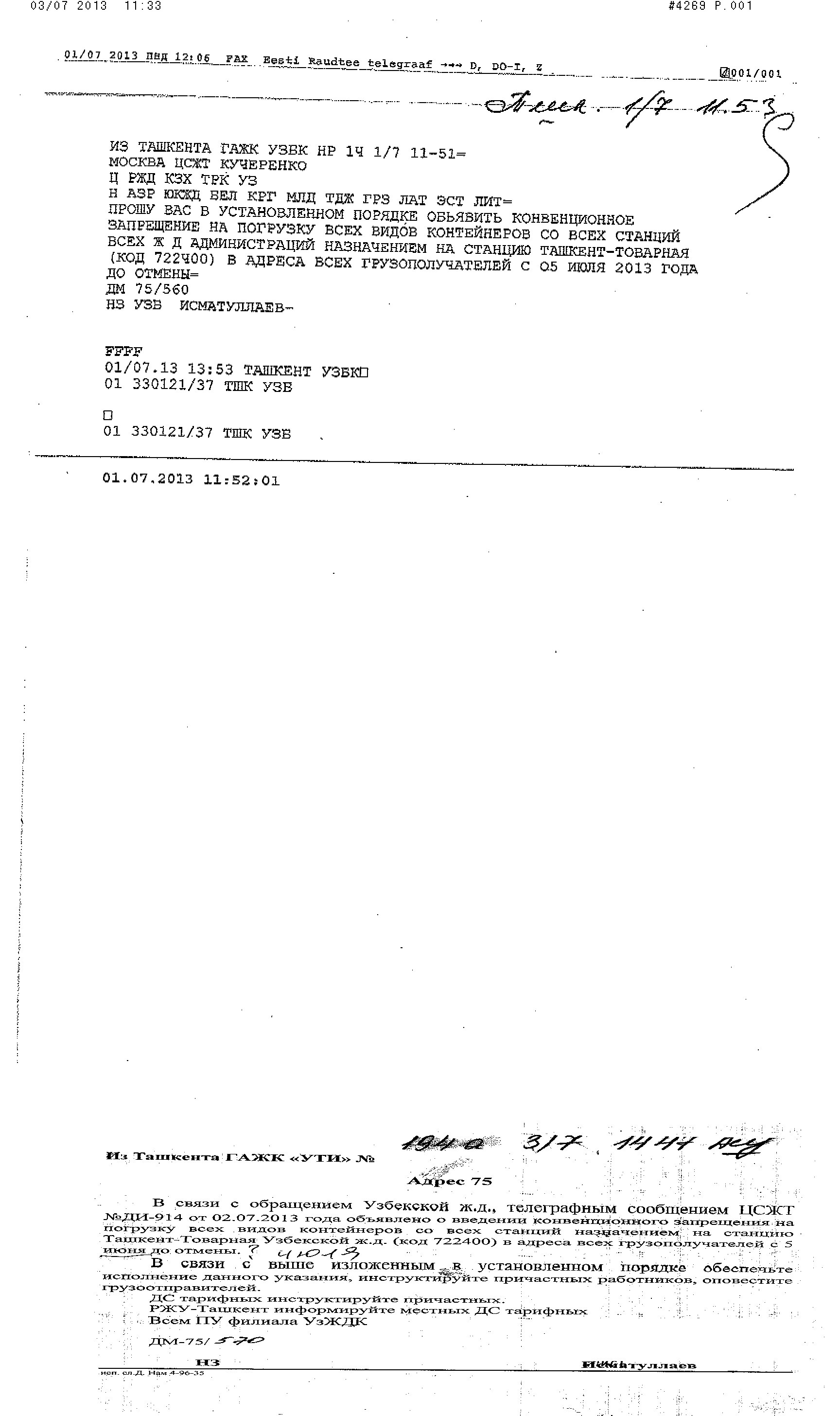 | Из Ташкента ГАЖК УЗВК НР 14 1/7 11-51 Москва ЦСЖТ Кучеренко Ц РЖД КЗХ ТРК УЗ Н АЗР ЮКЖД БЕЛ КРГ МЛД ТДЖ ГРЗ ЛАТ ЭСТ ЛИТ Прошу вас в установленном порядке объявить конвенционное запрещение на погрузку всех видов контейнеров со всех станций всех ж.д. администрации назначением на станцию Ташкент-Товарная (код 722400) в адреса всех грузополучателей с 05 июля 2013года до отмены. ДМ 75/560 НЗ УЗБ Исматуллаев Из Ташкента ГАЖК «УТИ» № 194 а 3/7 1447