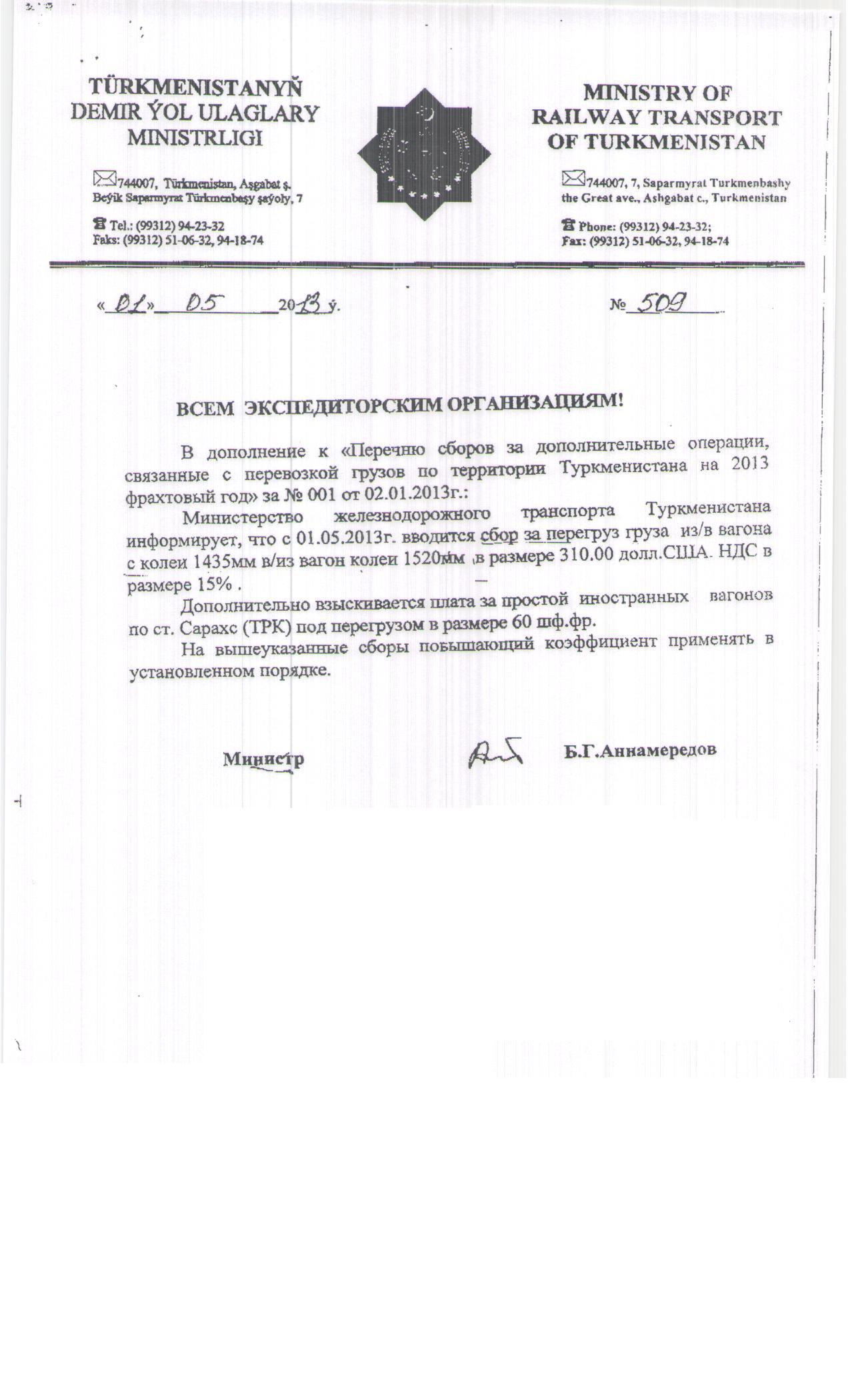 Министерство железнодорожного транспорта Туркменистана информирует, что с 01.05.2013г. вводится сбор за перегруз груза из/в вагона с колеи 1435мм в/из вагон колеи 1520мм ,в размере 310.00 долл.США. НДС в
