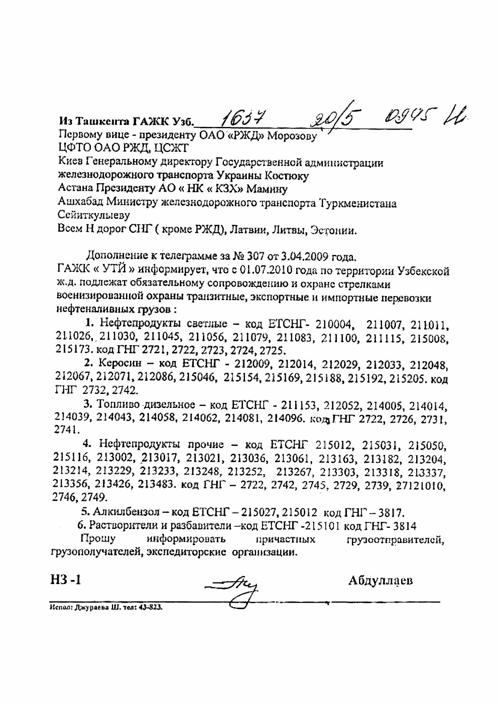 Дополнение к телеграмме за № 307 от 3.04.2009 года. ГАЖК «УТЙ» информирует, что с 01.07.2010 года по территории Узбекской ж.д. подлежат обязательному сопровождению и охране стрелками военизированной охраны транзитные, экспортные и импортные перевозки нефтеналивных грузов: 1. Нефтепродукты светлые – код ЕТСНГ – 210004, 211007, 211011, 211026, 211030, 211045, 211056, 211079, 211083, 211100, 211115, 215008, 215173, код ГНГ 2721, 2722, 2723, 2724, 2725. 2. Керосин – код ЕТСНГ – 212009, 212014, 212029, 212033, 212048, 212067, 212071, 212086, 215046, 215154, 215169, 215188, 215192, 215205. код ГНГ 2732, 2742. 3. Топливо – дизельное – код ЕТСНГ – 211153, 212052, 214005, 214014, 214039, 214043, 214058, 214062, 214081, 214096. код ГНГ 2722, 2726, 2731, 2741. 4. Нефтепродукты прочие – код ЕТСНГ – 215012, 215031, 215050, 215116, 213002, 213017, 213021, 213036, 213061, 213163, 213182, 213204, 213214, 213229, 213233, 213248, 213252, 213267, 213303, 213318, 213337, 213356, 213426, 213483. код ГНГ – 2722, 2742, 2745, 2729, 2739, 27121010, 2746, 2749. 5. Алкилбензол – код ЕТСНГ – 215027, 215012 код ГНГ – 3817. 6. Растворители и разбавители – код ЕТСНГ – 215101 код ГНГ – 3814 Прошу информировать причастных грузоотправителей, грузополучателей, экспедиторские организации.