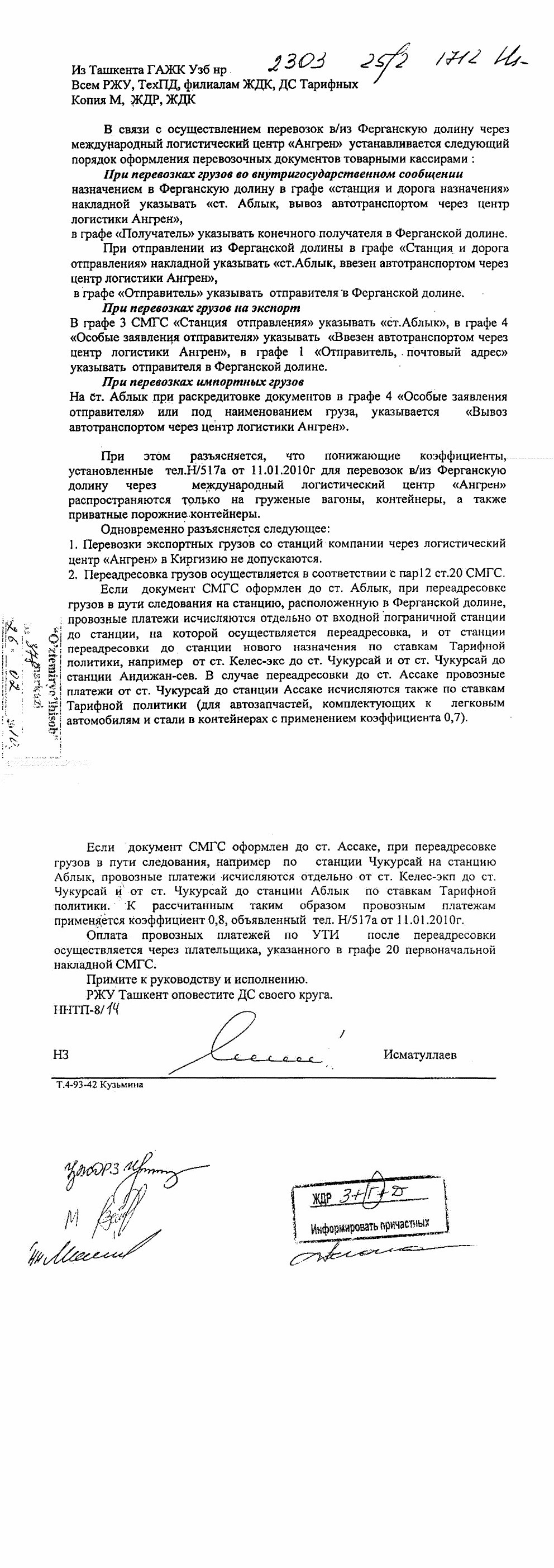 При этом разъясняется, что понижающие коэффициенты, установленные тел.Н/517а от 11.01.2010г. для перевозок в/из Ферганскую долину через международный логистический центр «Ангрен» распространяются только на груженые вагоны, контейнеры, а также приватные порожние контейнеры. Одновременно разъясняется следующее: 1. Перевозки экспортных грузов со станций компании через логистический центр «Ангрен» в Киргизию не допускаются. 2. Переадресовка грузов осуществляется в соответствии с пар 12 ст.20 СМГС. Если документ СМГС оформлен до ст. Аблык, при переадресовке грузов в пути следования на станцию, расположенную в Ферганской долине, провозные платежи исчисляются отдельно от входной пограничной станции до станции, на которой осуществляется переадресовка, и от станции переадресовки до станции нового назначения по ставкам Тарифной политики, например от ст. Келес-экс до ст. Чукурсай и от ст. Чукурсай до станции Андижан-сев. В случае переадресовки до ст. Ассаке провозные платежи от ст. Чукурсай до станции Ассаке исчисляются также по ставкам Тарифной политики (для автозапчастей, комплектующих к легковым автомобилям и стали в контейнерах с применением коэффициента 0,7). Если документ СМГС оформлен до ст. Ассаке, при переадресовке грузов в пути следования, например по станции Чукурсай на станцию Аблык, провозные платежи исчисляются отдельно от ст. Келес-экп до ст. Чукурсай и от ст. Чукурсай до станции Аблык по ставкам Тарифной политики. К рассчитанным таким образом провозным платежам применяется коэффициент 0,8, объявленный тел. Н/517а от 11.01.2010г. Оплата провозных платежей по УТИ после переадресовки осуществляется через плательщика, указанного в графе 20 первоначальной накладной СМГС. Примите к руководству и исполнению. РЖУ Ташкент оповестите ДС своего круга. ННТП – 8/14