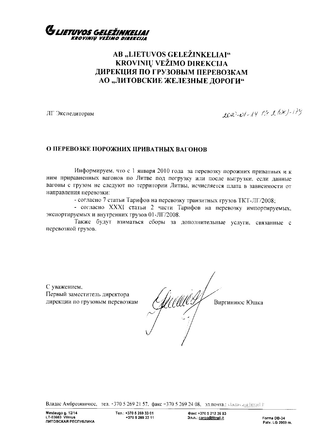 С уважением, Первый заместитель директора Дирекции по грузовым перевозкам Виргиниюс Юшка