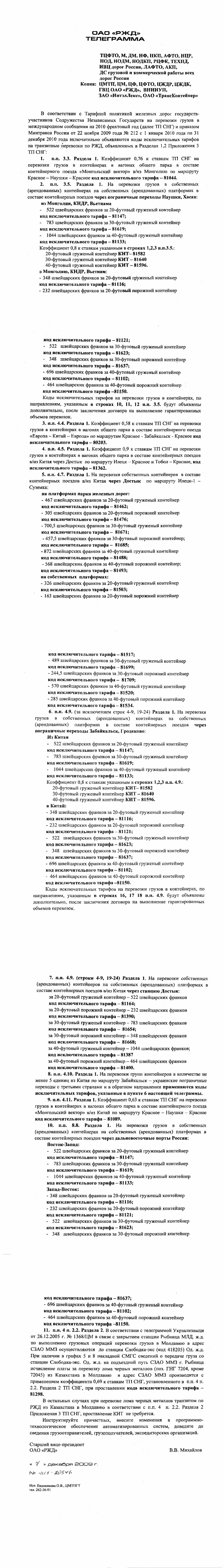 9. п.п. 4.11. Раздела 1. Коэффициент 0,63 к ставкам ТП СНГ на перевозки грузов в контейнерах в вагонах общего парка в составе контейнерного поезда «Монгольский вектор» в/из Китай по маршруту Красное - Наушки - Красное код исключительного тарифа - 81089. 10. п.п» 8.8. Раздела 1. На перевозки грузов в собственных (арендованных) контейнерах на собственных (арендованных) платформах в составе контейнерных поездов через дальневосточные порты России: Восток-Запад: -522 швейцарских франков за 20-футовый груженый контейнер код исключительного тарифа - 81147; -783 швейцарских франков за 30-футовый груженый контейнер код исключительного тарифа - 81619; -1044 швейцарских франков за 40-футовый груженый контейнер код исключительного тарифа - 81133; Запад-Восток: -348 швейцарских франков за 20-футовый груженый контейнер код исключительного тарифа - 81116; -232 швейцарских франков за 20-футовый порожний контейнер код исключительного тарифа - 81121; -522 швейцарских франков за 30-футовый груженый контейнер код исключительного тарифа - 81623; -348 швейцарских франков за 30-футовый порожний контейнер код исключительного тарифа - 81637; -696 швейцарских франков за 40-футовый груженый контейнер код исключительного та рифа - 81102; -464 швейцарских франков за 40-футовый порожний контейнер код исключительного тарифа -81150. 11. п.п. 4 п. 2.2. Раздела 2. В соответствии с телеграммой Укрзализныци от 26.12.2005 г. № 1368/ЦМ в связи с закрытием станции Рыбница МЛД. ж.д. по выполнению грузовых операций перевозки грузов в Молдавию в адрес СЗАО ММЗ осуществляются до станции Слободка-экс (код 418205) Од. ж.д. При наличии в графах 5 и 8 накладной СМГС сведений о передаче груза со станции Слободка-экс. Од. ж.д. на подъездной путь СЗАО ММЗ г. Рыбница исчисление платы за перевозку лома черных металлов (поз. ГНГ 7204, кроме 72045) из Казахстана в Молдавию в адрес СЗАО ММЗ производится с применением коэффициента 0,69 к ставкам ТП СНГ, установленного в п.п 4 п. 2.2. Раздела 2 ТП СНГ, при проставлении кода исключительного тарифа - 81298. В остальных случаях при перевозке лома черных металлов транзитом по РЖД из Казахстана в Молдавию в соответствии с п.п. 4 п. 2.2. Раздела 2 Приложения 3 ТП СНГ, проставление КИТ не требуется. Инструктируйте причастных, внесите изменения в программно-технологическое обеспечение автоматизированных систем, доведите до сведения грузоотправителей, грузополучателей, экспедиторских организаций.